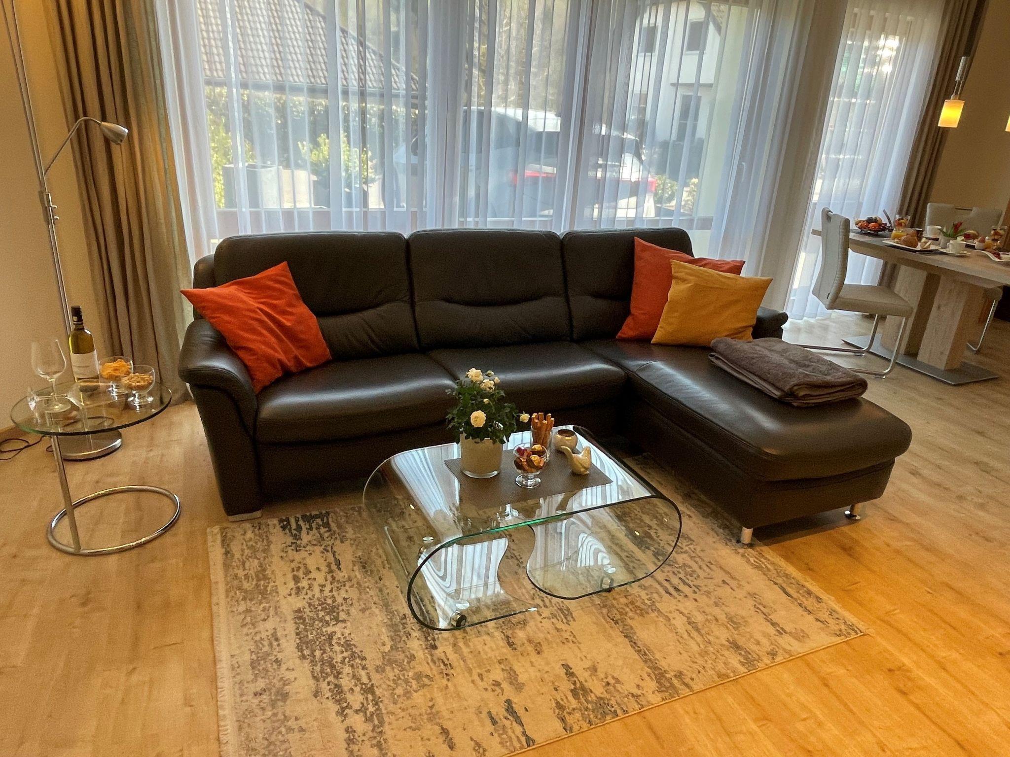 The modern fitted kitchen is equipped with branded built-in appliances, small appliances and stylish crockery and has a spacious dining area with comfortable chairs. There is a cosy dining/living area with a leather seating area and a modern shower room.In the bedroom, an electrically adjustable box-spring bed ensures sleeping comfort and pure relaxation, and a wardrobe with sliding doors and mirror is available for your wardrobe.Facilities in detail:OutsideGroomed outdoor facilities, garden furniture, parasol, beach chair, barrier-free, car park directly in front of the FEWO, paved terrace, storage space for your bicycles and storage space for e-bikes in the property free of charge and e-charging possibility for your car - for a fee - directly at the property. Living area:Dining table with 4 chairs, coffee table, leather couch, side table, modern wall unit, floor lamp.KitchenModern fitted kitchen with granite worktop, oven with top and bottom heat and convection, separate freezer compartment, dishwasher, coffee machine and on request Nespresso capsule machine with milk frother, toaster, kettle, egg cooker, Bosch food processor (on request), dishcloths and tea towels. Sanitary facilitiesModern barrier-free shower room with rainforest shower, washbasin, illuminated mirror, towel dryer, WC, towels, washing machine. Sleeping areaBedroom with electric box-spring bed (0.90m x 2m, 4-door wardrobe, hairdryer, maco satin or jersey bed linen, 2-4 towels and 1 shower towel per person, roller blinds. Extra duvets and microfibre blankets are available in the wardrobe. EntertainmentInternet - free of charge, W-Lan, CD player, hi-fi system with USB input, radio, LCD/LED satellite TV (internet-enabled).