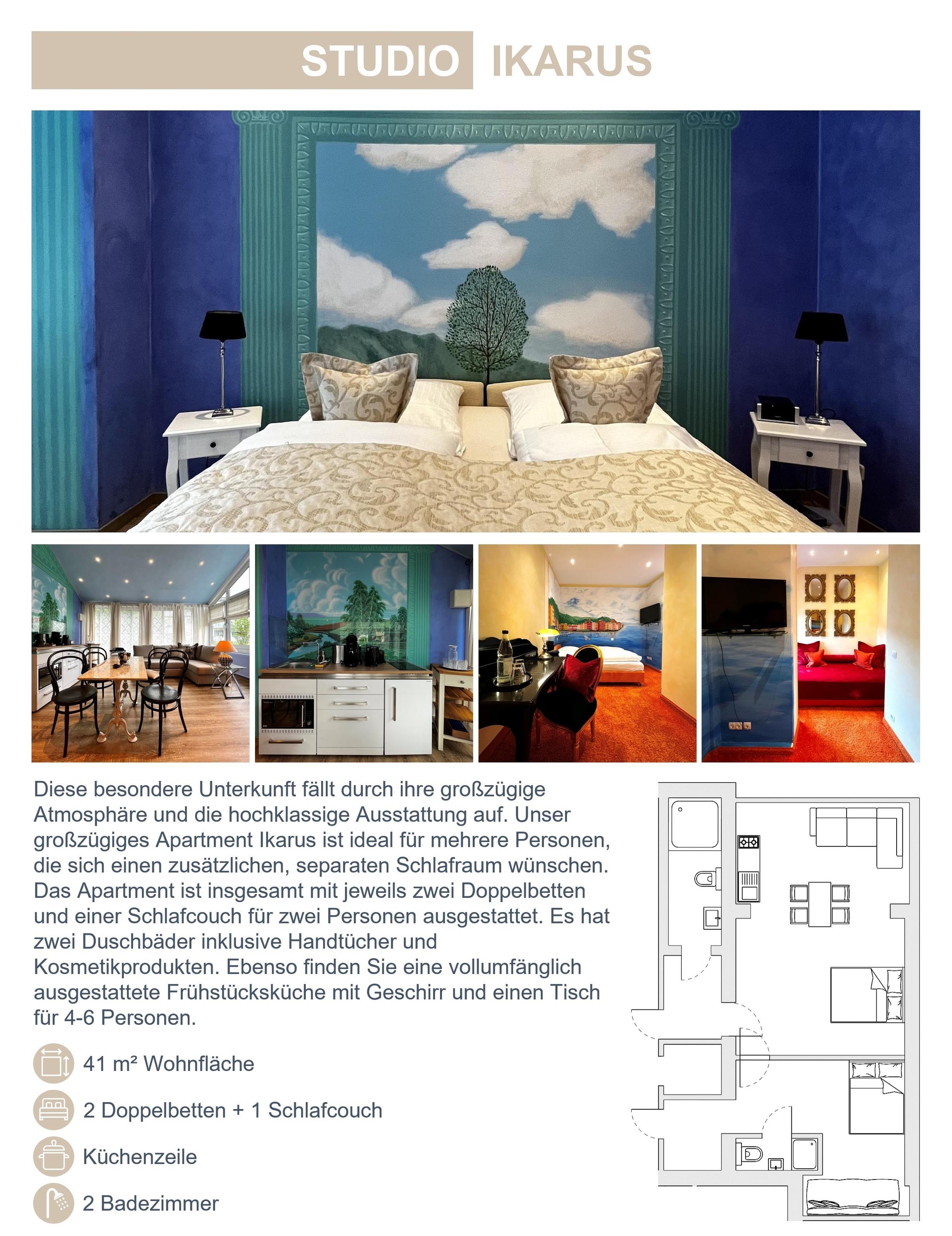 Unser Apartment Ikarus ist ideal für Familien oder für Freunde, die sich seperaten Schlafraum wünschen (4-6 Personen) Das Apartment ist ausgestattet mit jeweils zwei Boxspringbetten und einer Schlafcouch für zwei Personen, zwei Duschbäder inklusive Handtücher und eine ausgestattete Frühstücksküche.