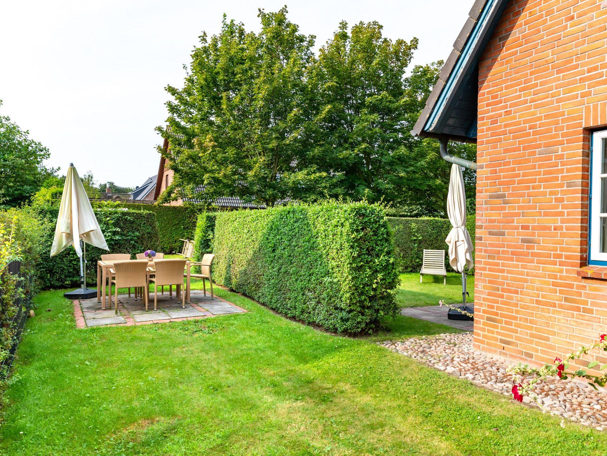 Zur Wohnung gehört ein kleiner Garten mit Essgruppe, Sonnenliegen und einem Strandkorb. Waschmaschine und Trockner sind gegen Gebühr gemeinschaftlich nutzbar. Vor dem Haus befindet sich ein großzügiger Parkplatz, Abstellmöglichkeiten für Fahrräder sind vorhanden. Hinter dem Haus liegt der großzügige und gepflegte Garten.