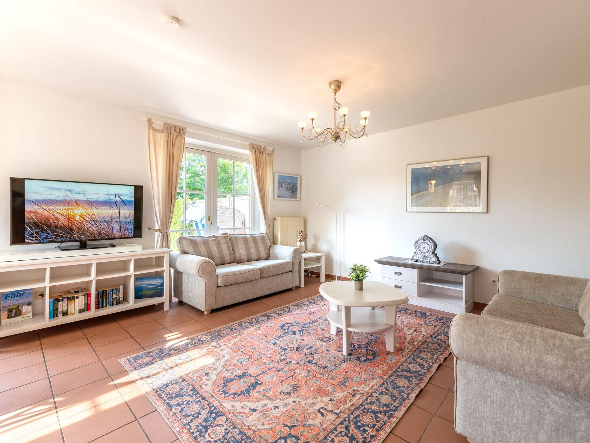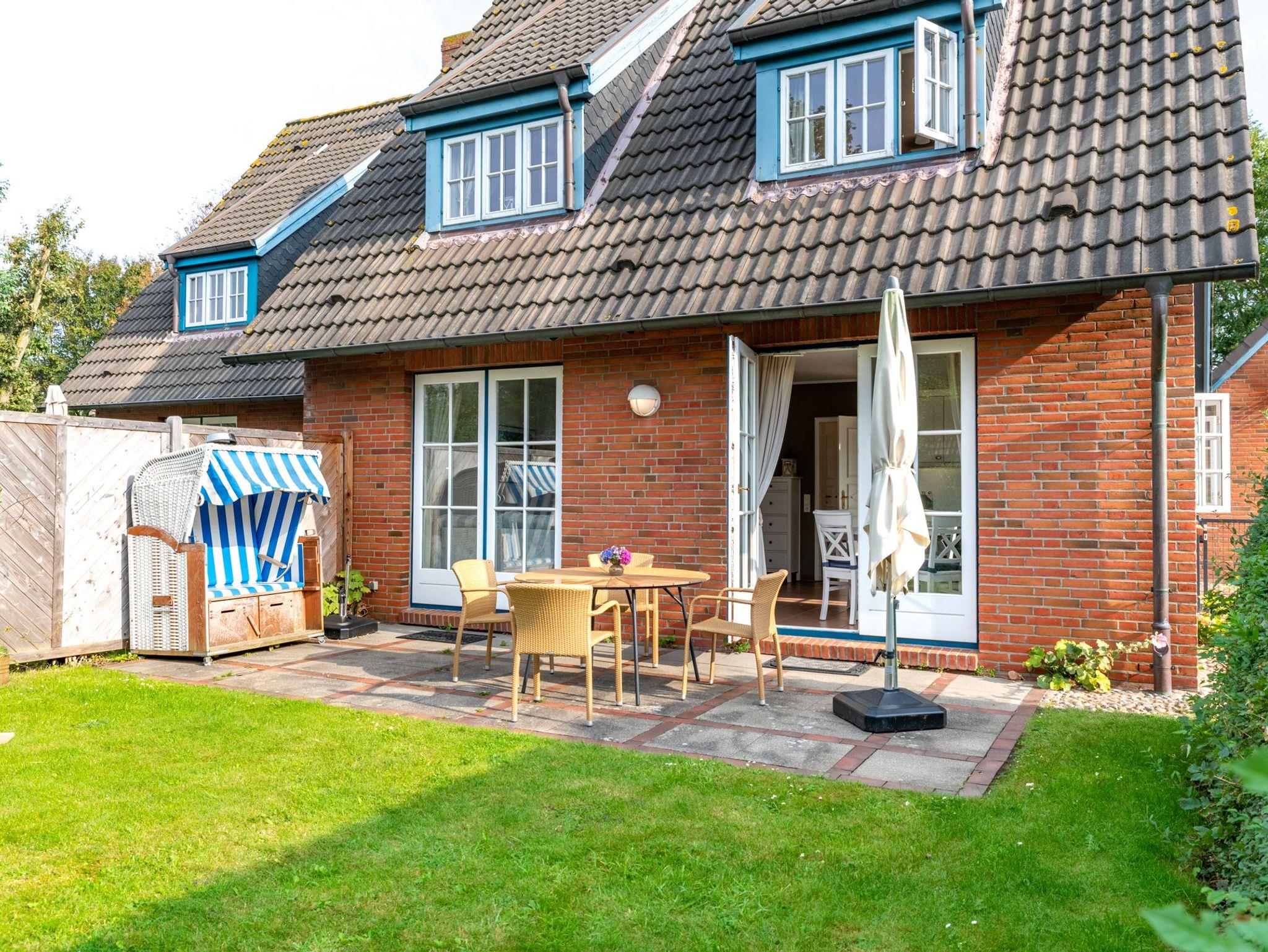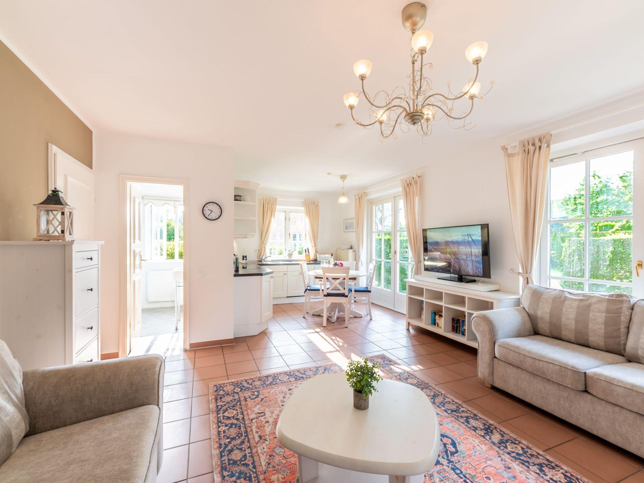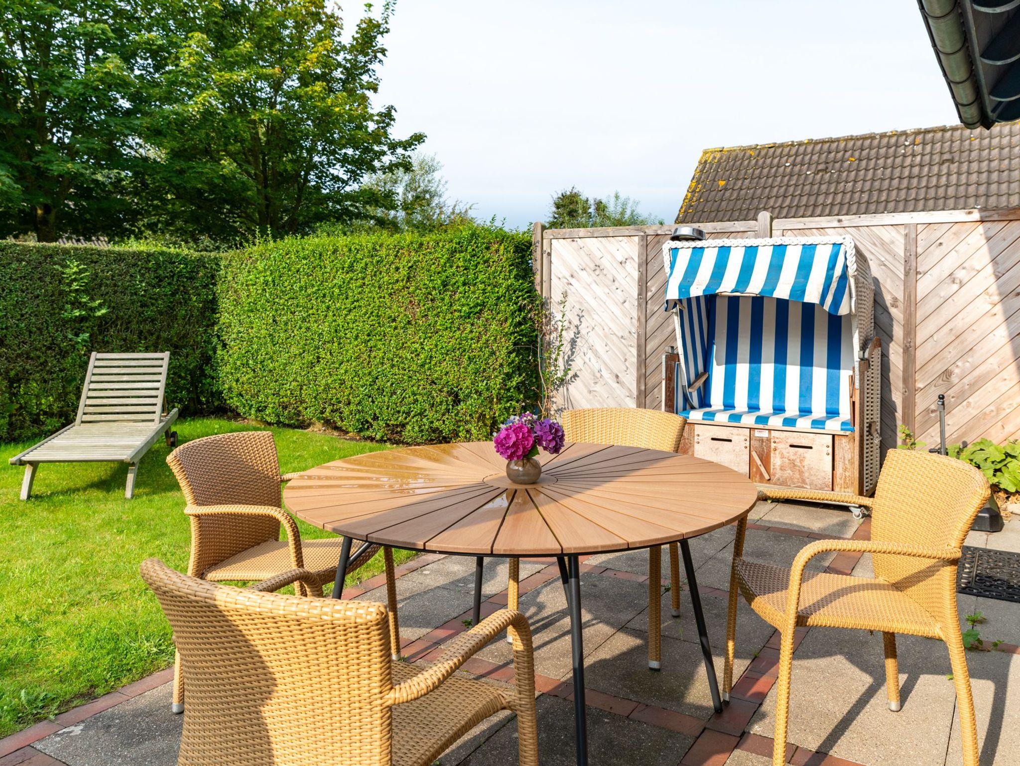 Die Ferienwohnung verfügt über einen gemütlichen Wohn- und Essbereich mit offener, gut ausgestattet Küche. Dort finden Sie u.a. einen Geschirrspüler, ein Backofen mit Cerankochfeld und einen Esstisch. Das separate Schlafzimmer ist mit einem Doppelbett ausgestattet. Das Duschbad ist modern ausgestattet. Im Garten befindet sich eine zur Wohnung dazu gehörige Terrasse samt Gartenmöbeln, Sonnenliegen, Sonnenschirm und Strandkorb. Waschmaschine und Trockner sind gegen Gebühr gemeinschaftlich nutzbar.