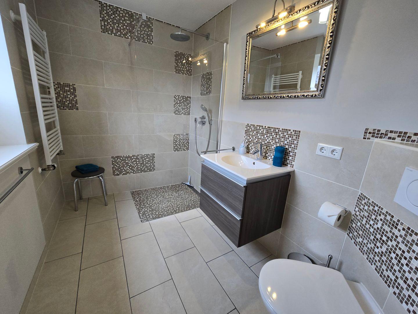 Im Erdgeschoss befinden sich: das Wohnzimmer mit angrenzendem Esszimmer, die sehr gut ausgestattete Küche, das Badezimmer mit einer bodengleichen Dusche, Föhn und Fenster, sowie der Flur mit Garderobe. Im 1.OG finden Sie ein Schlafzimmer mit einem Doppelbett (180 x 200 cm) und einem TV, ein zweites Schlafzimmer mit einem Einzelbett (90 x 200 cm), einem Einbauschrank und einem TV, das zweite Badezimmer mit einer bodengleichen Dusche, Föhn und Fenster und ein Ankleideraum mit einem Schrank, einer Kommode und einer Waschmaschine. Von diesem Zimmer aus führt eine Treppe zum Dachgeschoss in dem sich das dritte Schlafzimmer mit einem Doppelbett (140 x 200 cm), einer Kommode und einem TV befindet. WLAN, CD-Spieler, Radio, Bücher, DVD´s und Gesellschaftsspiele sorgen für die Unterhaltung. Ein PKW-Stellplatz gehört zum Haus. Ihre Fahrräder können direkt am Haus abgestellt werden.