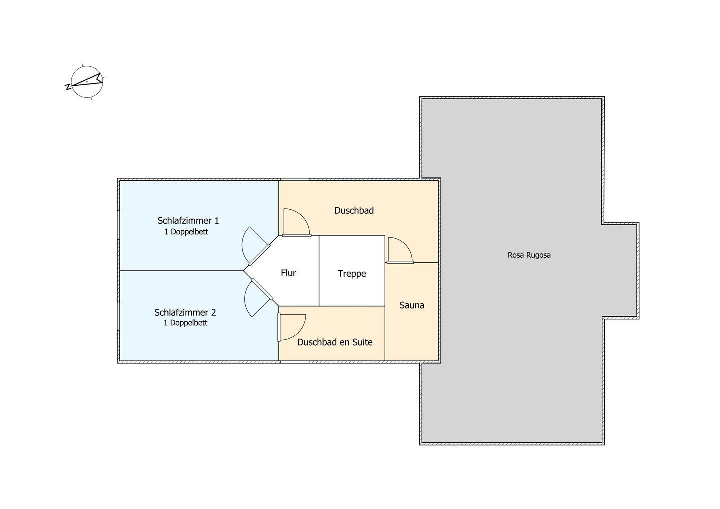 Die Doppelhaushälfte verfügt über zwei Doppelschlafzimmer, eines davon en Suite und eine individuell eingebaute Sauna. Die Bäder sind mit Raindanceduschen ausgestattet. Ein Kneippschlauch erfreut die Saunagänger.