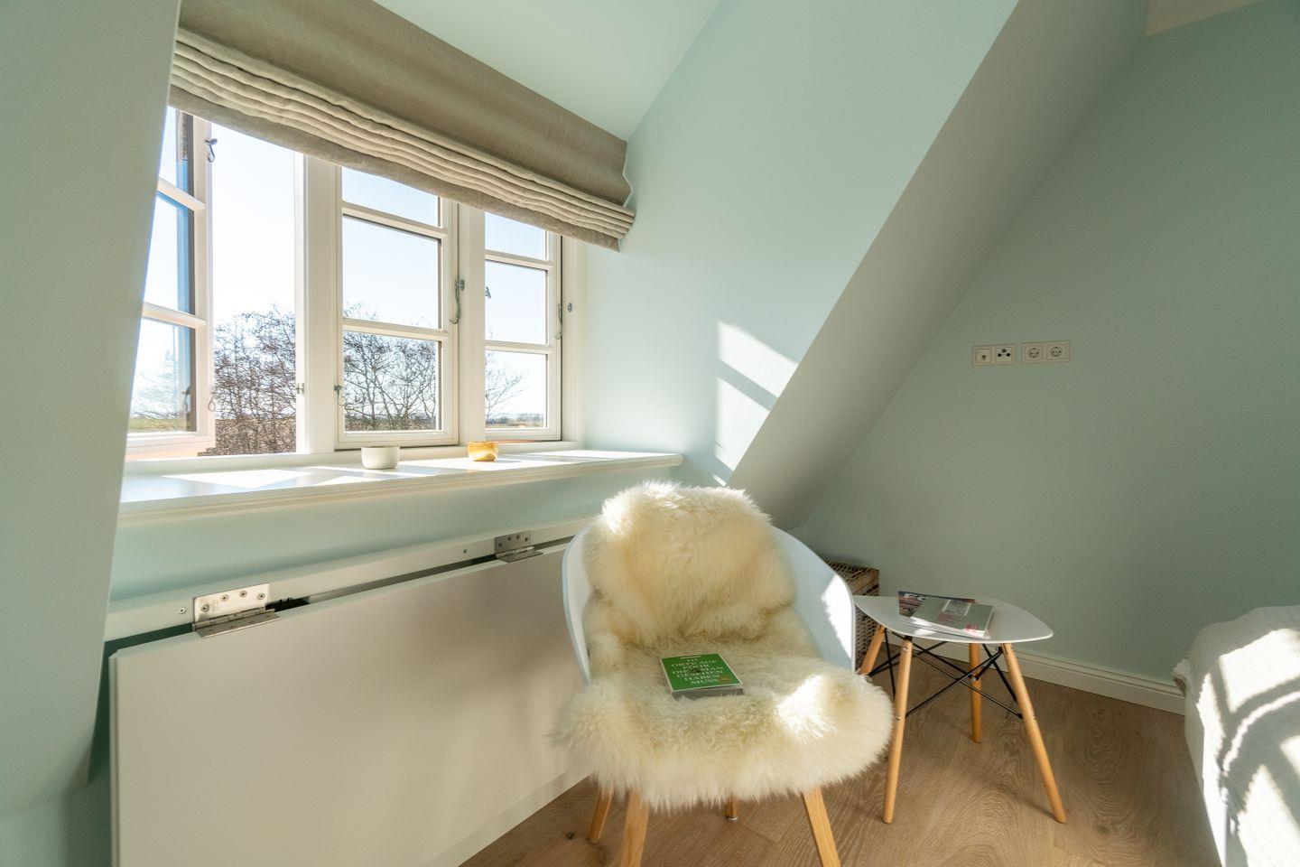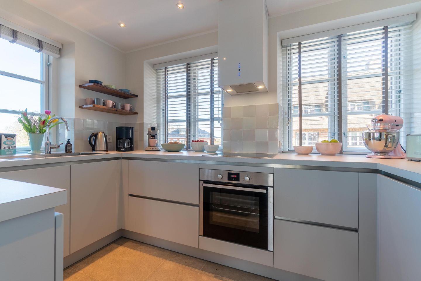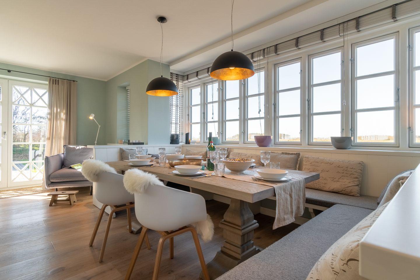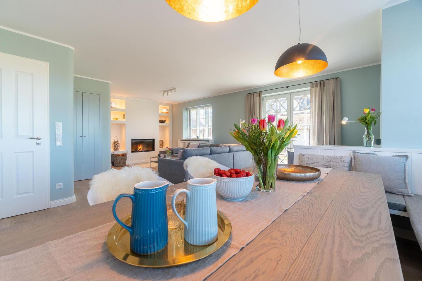 Im Erdgeschoss befindet sich der große und lichtdurchflutete Wohnbereich mit offener Küche und Kamin sowie einer großen Fensterfront im Essbereich und einer friesischen Utluchtbank. In der modern ausgestatteten hellen Küche finden Sie alles, was Sie zum Kochen benötigen, inklusive Kitchenaid, Kaffee- und Senseomaschine.