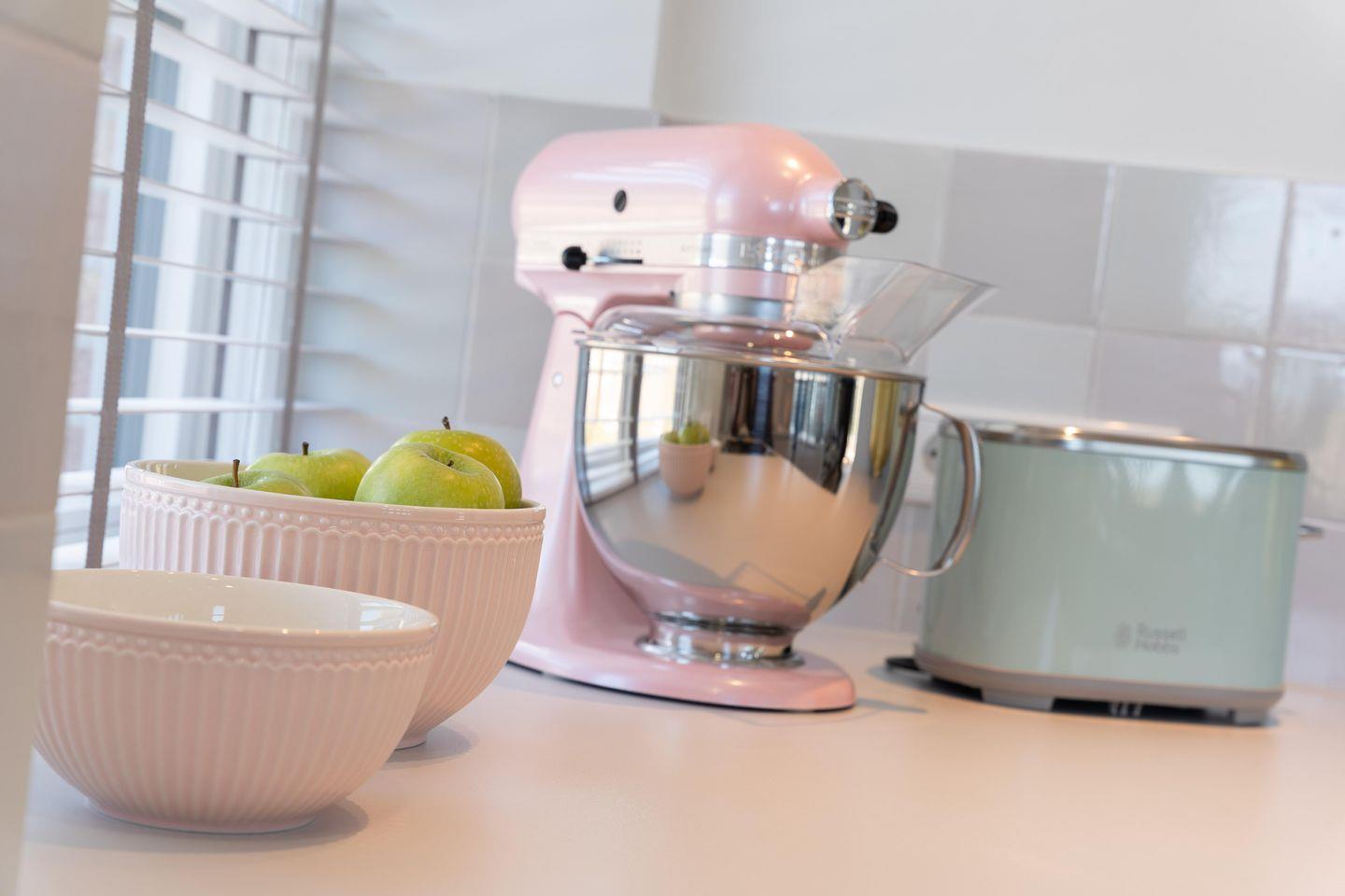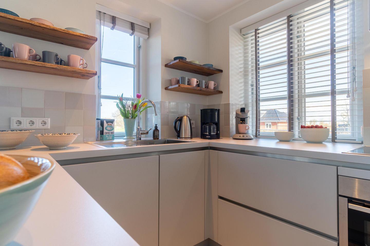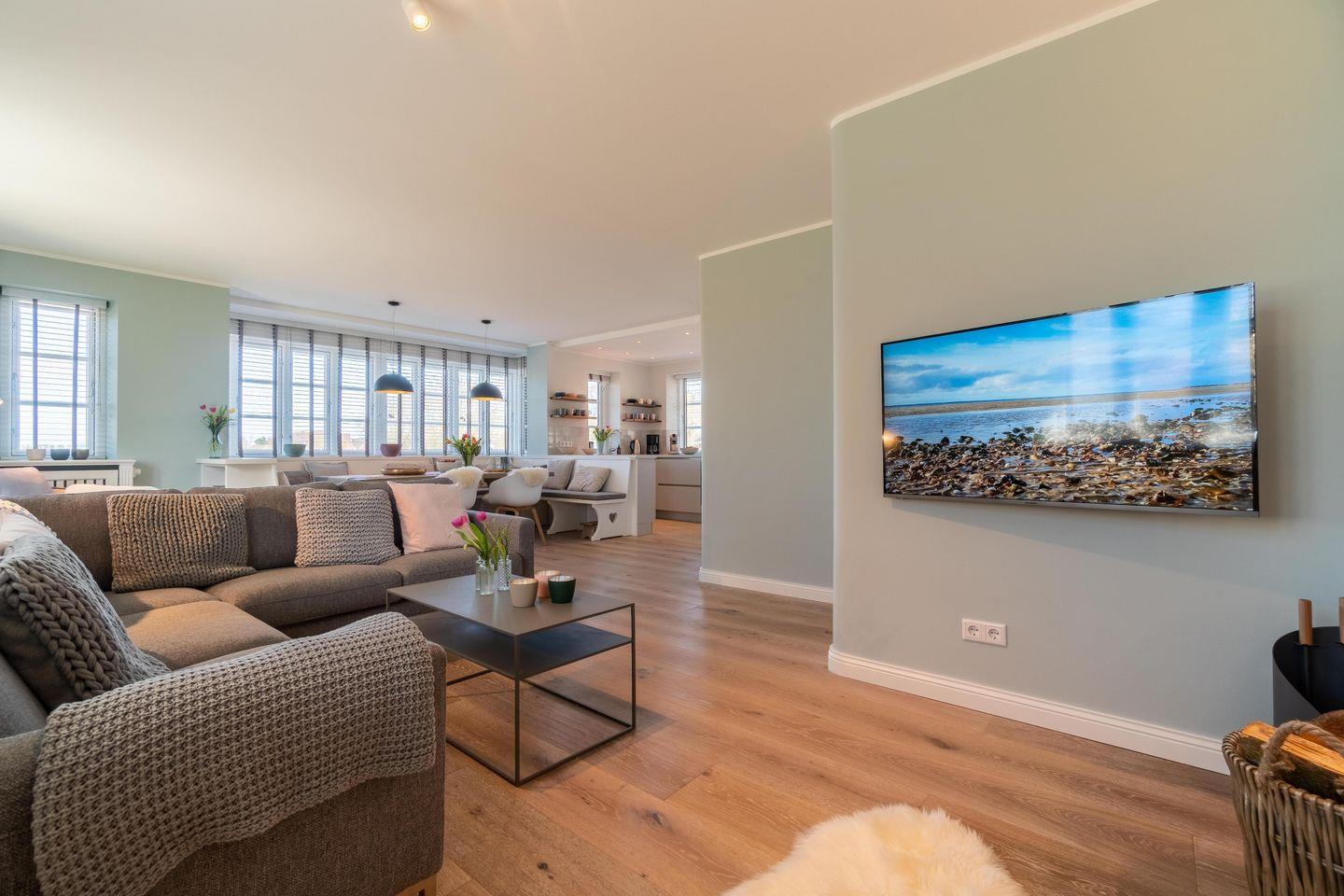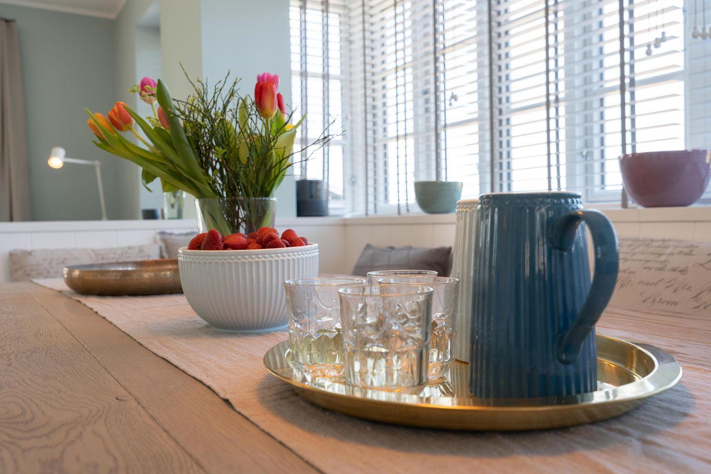 Im Erdgeschoss befindet sich der große und lichtdurchflutete Wohnbereich mit offener Küche und Kamin sowie einer großen Fensterfront im Essbereich und einer friesischen Utluchtbank. In der modern ausgestatteten hellen Küche finden Sie alles, was Sie zum Kochen benötigen, inklusive Kitchenaid, Kaffee- und Senseomaschine.