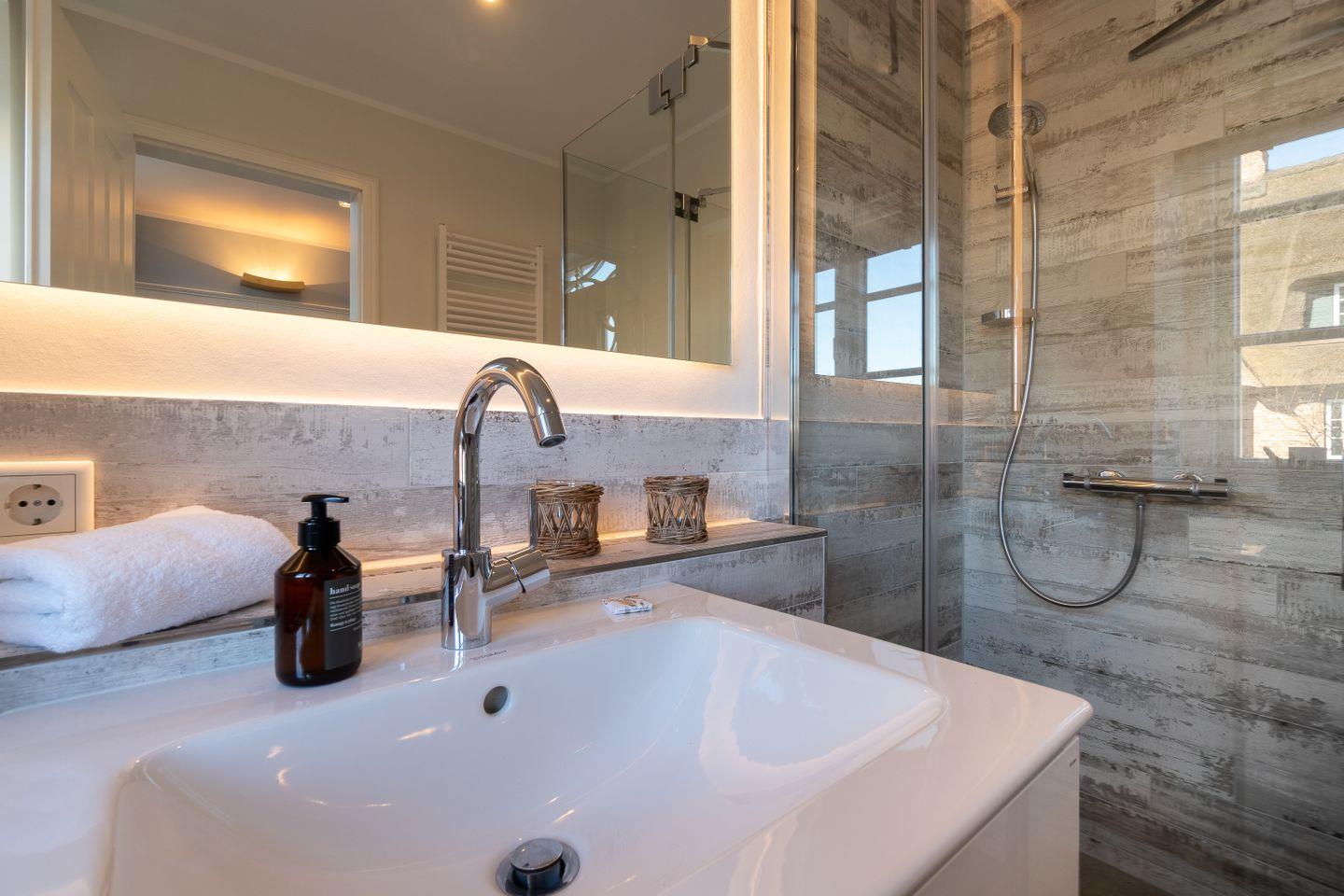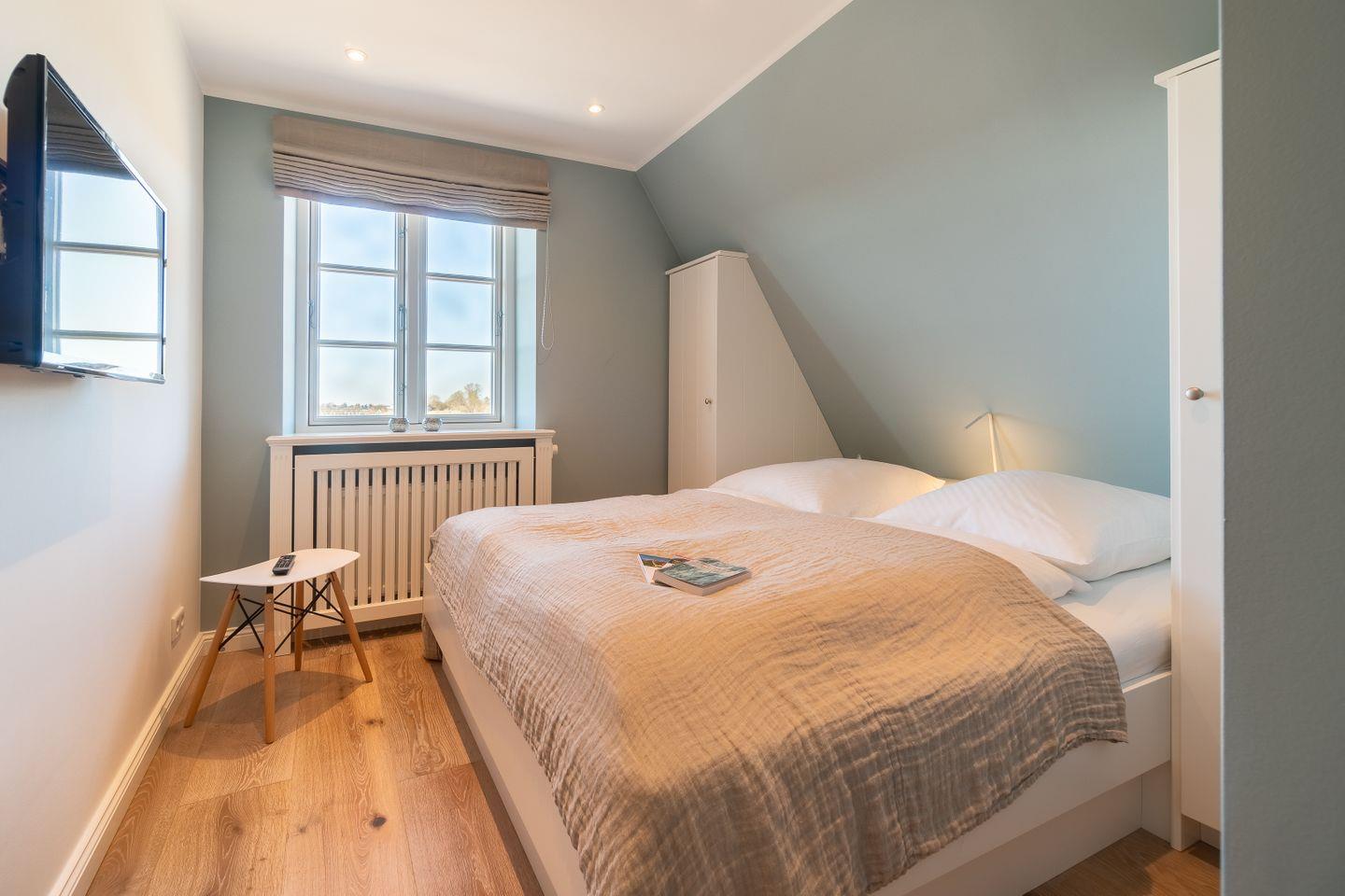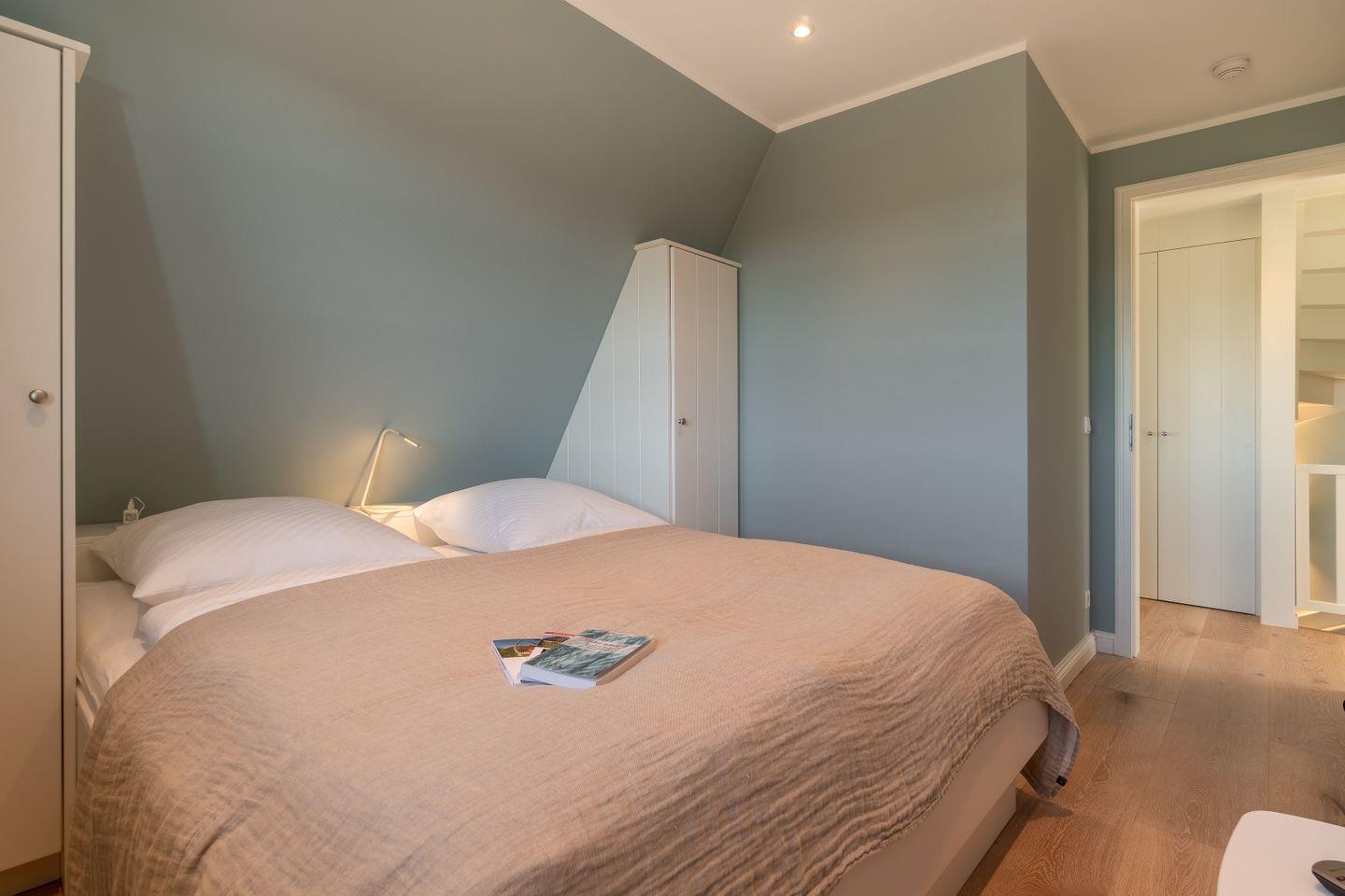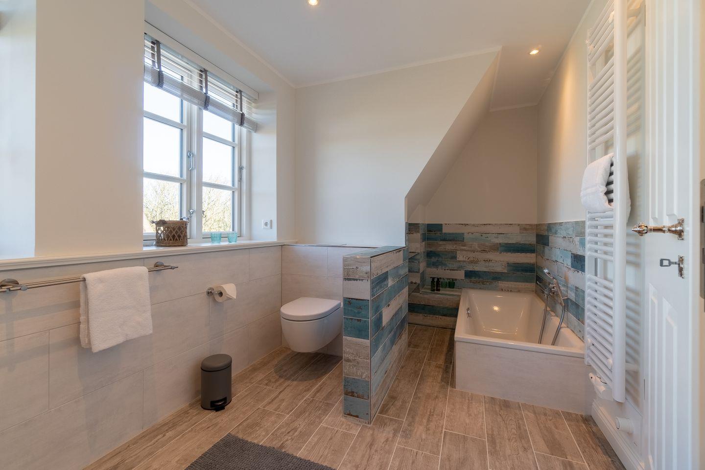 Die drei liebevoll mit Tischlereinbauten eingerichteten Schlafzimmer im Dachgeschoss sind mit 2 Betten pro Zimmer ausgestattet: 2 Schlafzimmer verfügen über Doppelbetten, 1 Zimmer hat zwei Einzelbetten. Zwei der Schlafzimmer sind mit Smart-TVs ausgestattet. Im großzügigen Badezimmer befinden sich eine Regenschauerdusche und eine Badewanne.