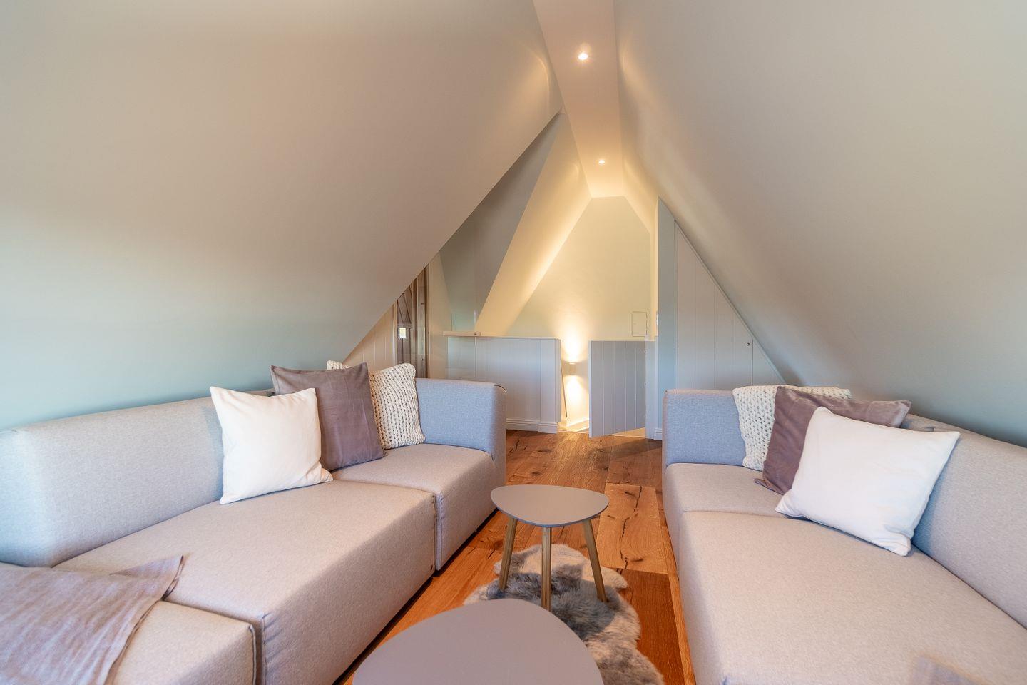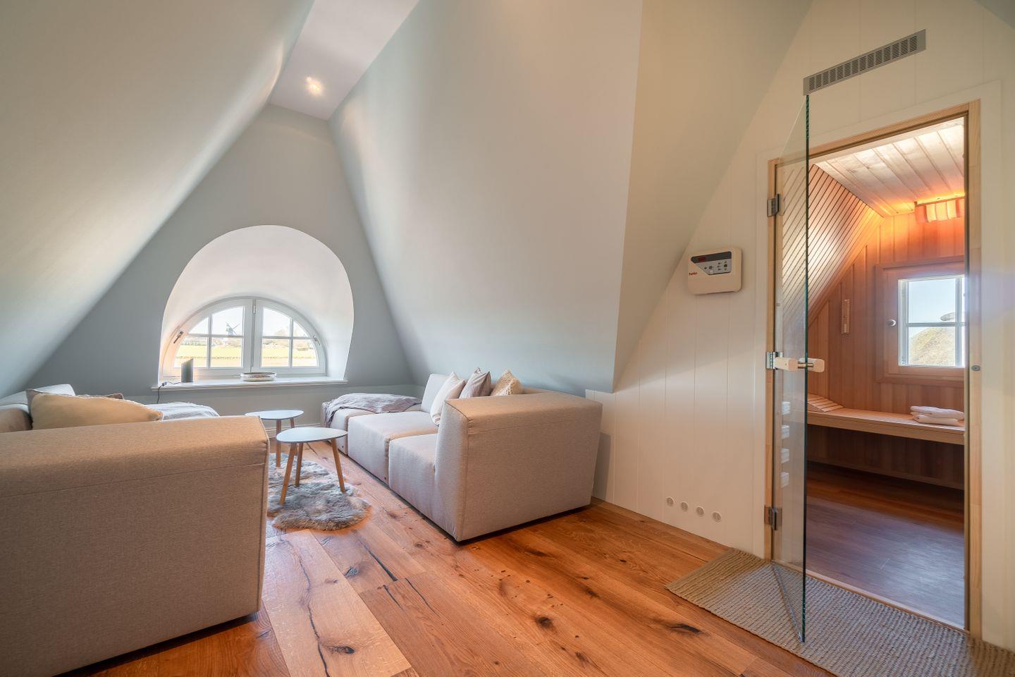 Der Saunabereich mit Relaxzone befindet sich im Dachboden. Von den beiden Loungesofas haben Sie einen traumhaften Blick Richtung Mühle und von hier aus können Sie abendliche Sonnenuntergänge genießen.