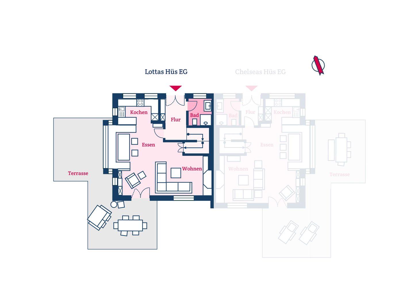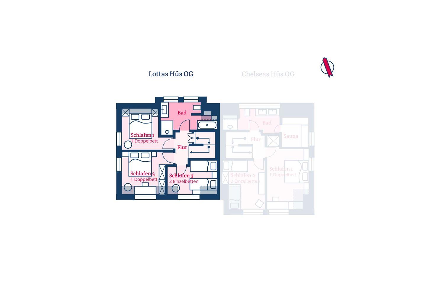 Lottas Hüs beeindruckt durch die exklusive ruhige Lage, den Blick über Felder bis zur Nordsee, über das Watt bis zur Insel Amrum. Die Atmosphäre von Lottas Hüs lädt zum Wohlfühlen und Entspannen ein. Der Grundriss des Hauses wurde nach Feng-Shui-Kriterien gestaltet. Die hochwertige Einrichtung ist geprägt durch Design, auf der Insel gefertigte Tischlereinbauten, Naturholz- und Natursteinböden sowie Kreidefarben. Zum Wohlfühlen in jeder Jahreszeit ist das Haus mit Sauna, Kamin, Regenschauerdusche und Vollbad ausgestattet. Die ruhige Lage am Strunwoi bietet Ruhe und Erholung. Strunwoi ist friesisch und bedeutet Strandweg. Der Naturstrand von Borgsum ist nur 700 Meter entfernt und lädt zu herrlichen Strandspaziergängen ein.