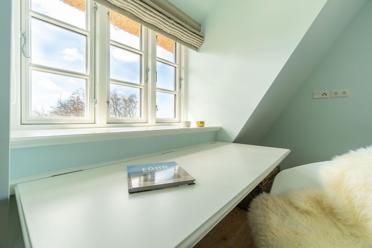 Auf den beiden Außenterrassen mit hauseigenem Strandkorb können Sie die Aussicht bei Sonne und Wind Richtung Borgsumer Mühle oder über die Felder bis zur Insel Amrum (in Abhängigkeit der Jahreszeiten) genießen.