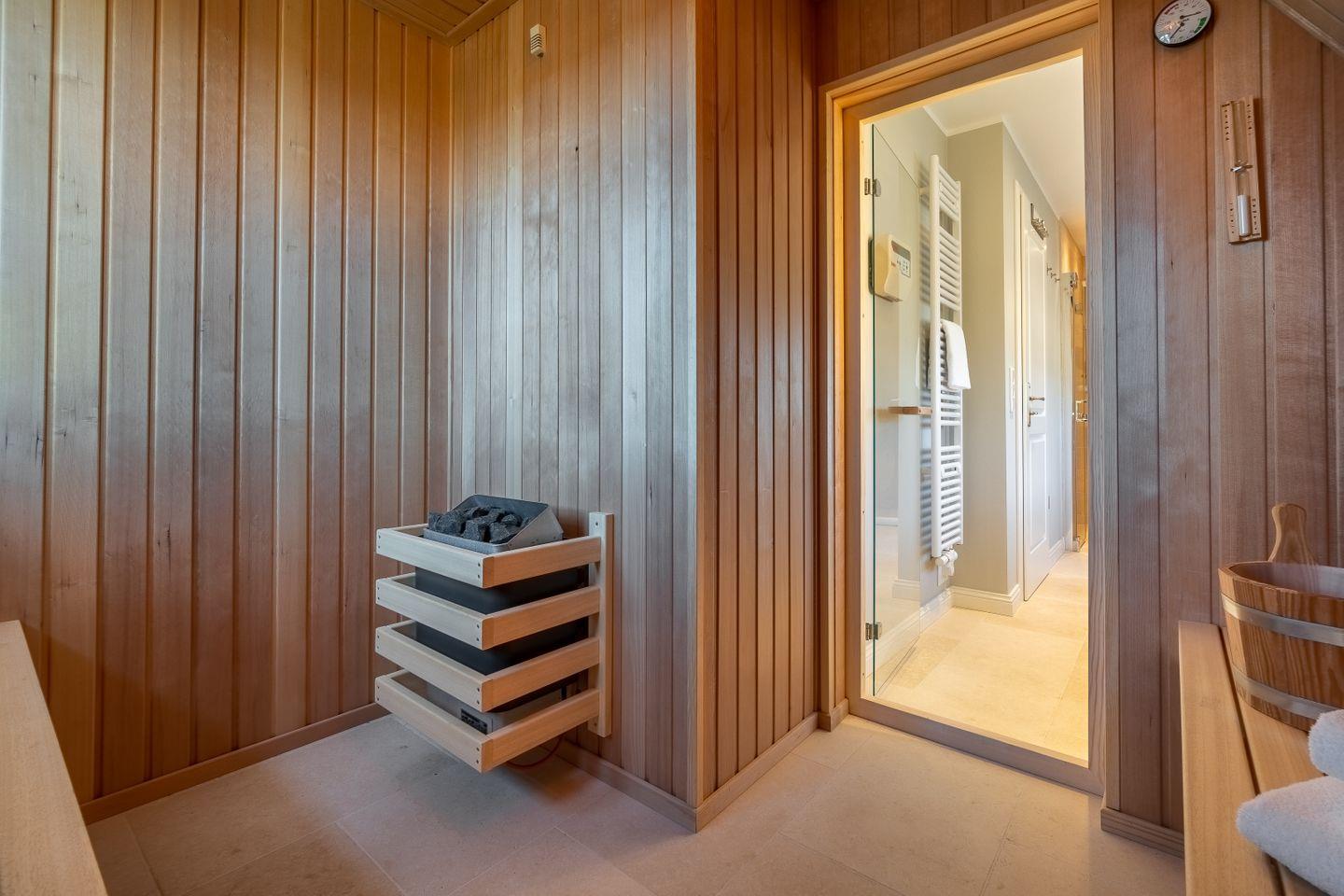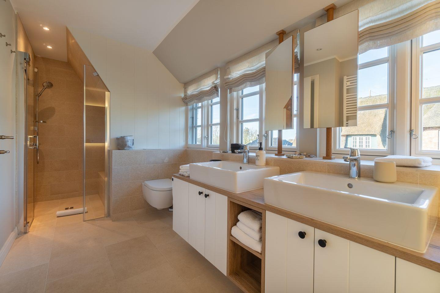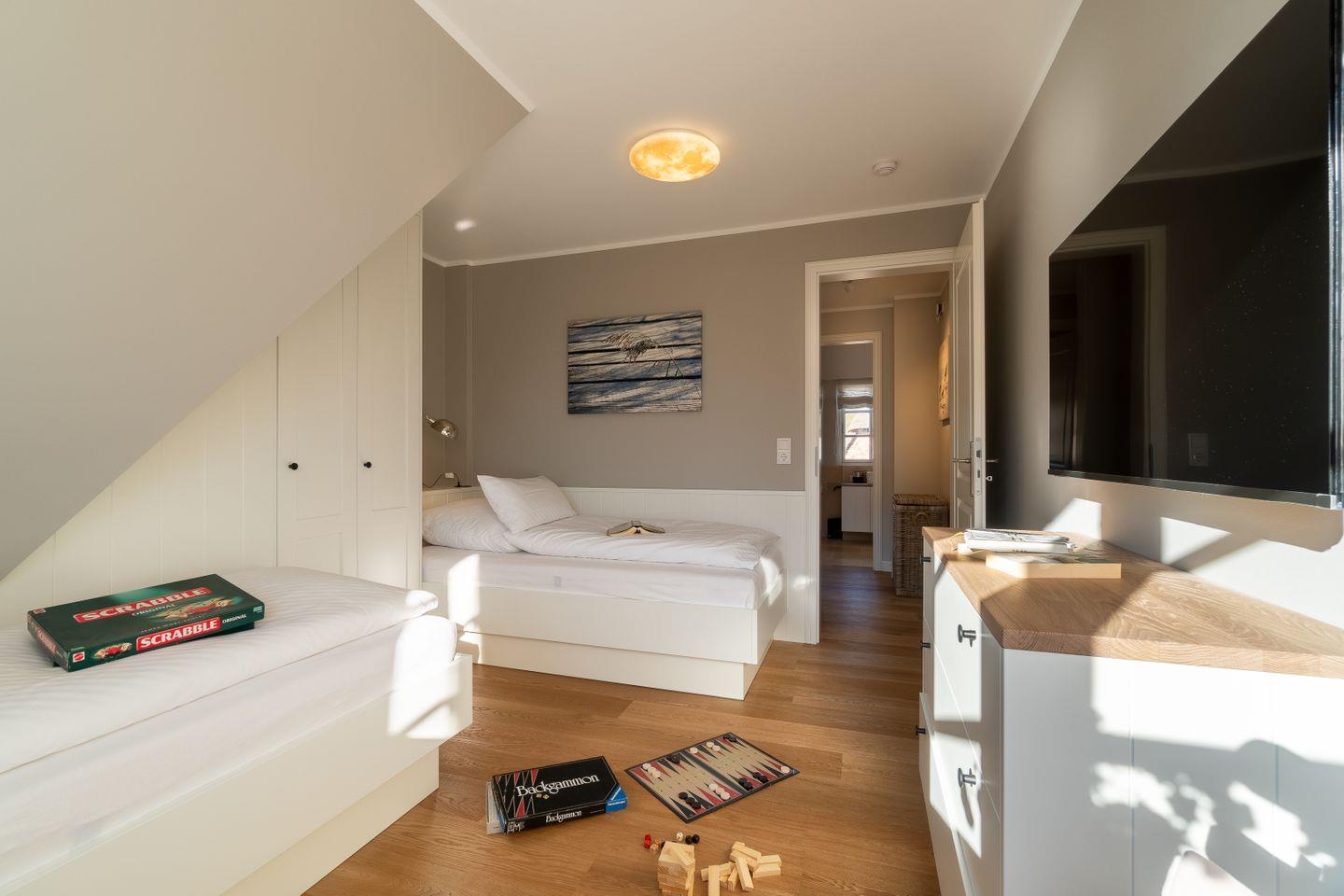 Im Obergeschoss befinden sich die zwei Schlafzimmer mit einem Doppelbett und zwei Einzelbetten, sowie die hauseigene Sauna im zweiten Duschbad.