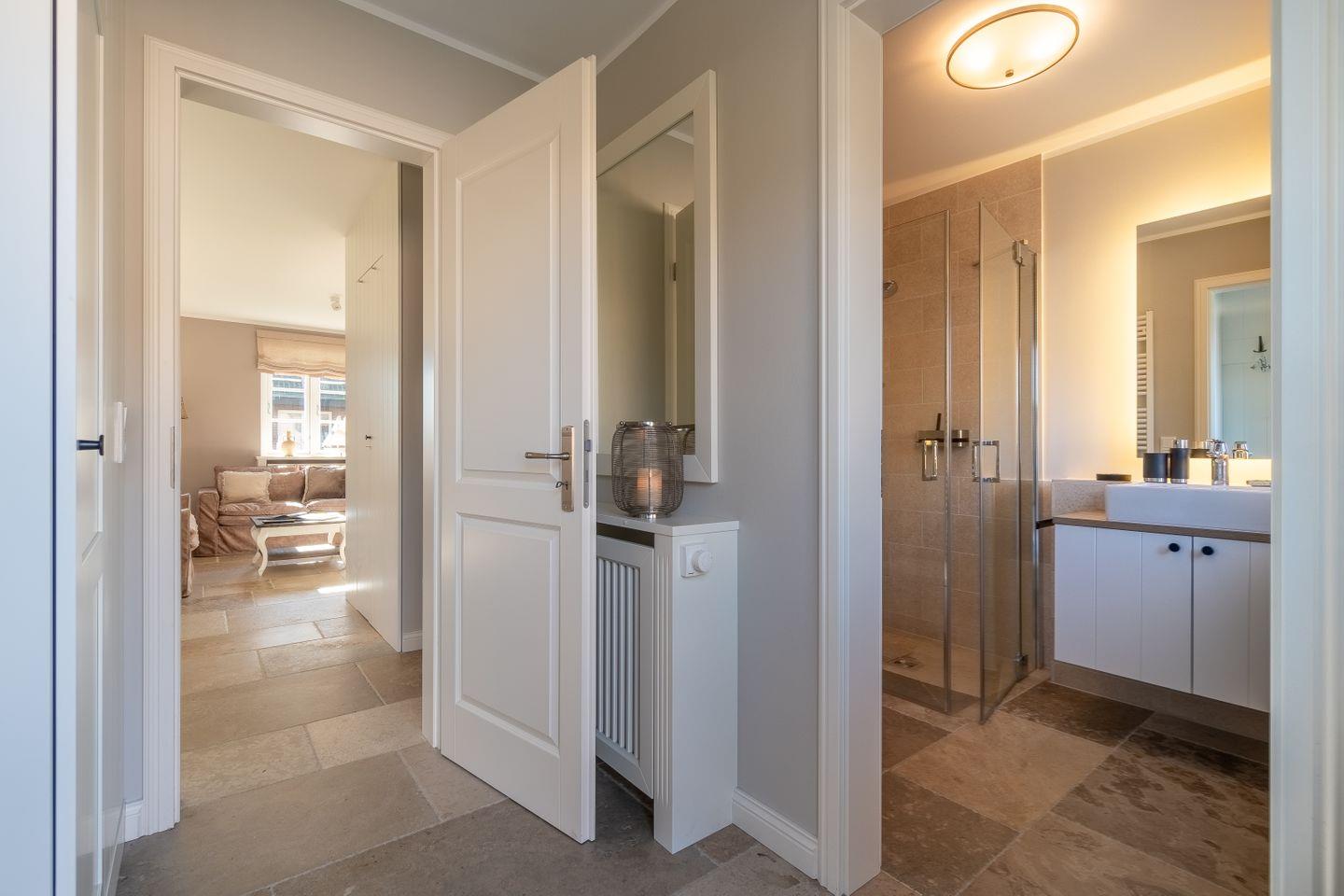 Im Erdgeschoss befinden sich der großzügige Wohn- und Essbereich mit offener Küche sowie eines der Duschbäder. Über den Wohnbereich gelangen Sie direkt auf die eigene Terrasse und in den Garten. Der Kamin spendet wohlige Wärme an kühlen Tagen. Zur Küchenausstattung gehört neben diversen Geräten auch ein Thermomix sowie eine Kitchenaid (Bei Buchung des hochwertigen Ferienhausteil können die Küchengeräte kostenfrei hinzugebucht werden).