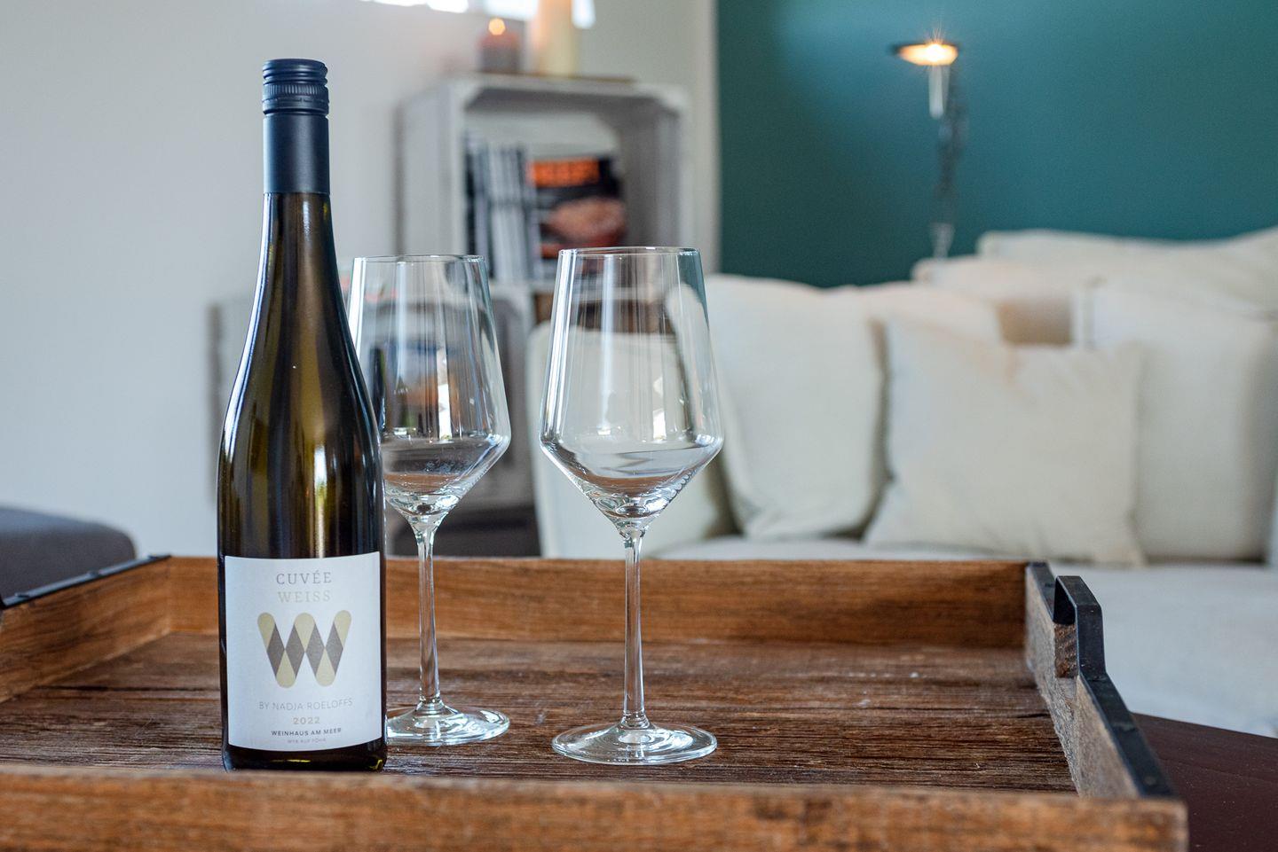 Bei Begrüßung erwartet Sie neben einer Flasche Wein und Wasser ein Präsentkorb im Einkaufswert in Höhe von 75 €, der ausschließlich Produkte der Insel Föhr in Abhängigkeit der Jahreszeiten und Verfügbarkeiten bereithält, individuell für Sie zusammengestellt.