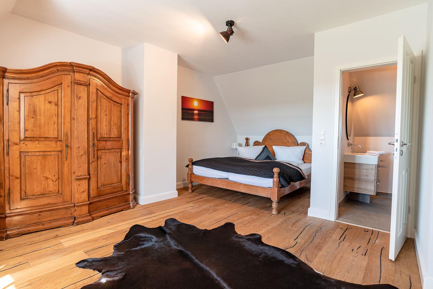 Im Obergeschoss sind die vier Schlafzimmer und die vier Duschbäder gelegen. Alle Schlafzimmer sind mit jeweils einem Doppelbett ausgestattet. Zwei der Bäder liegen en Suite.