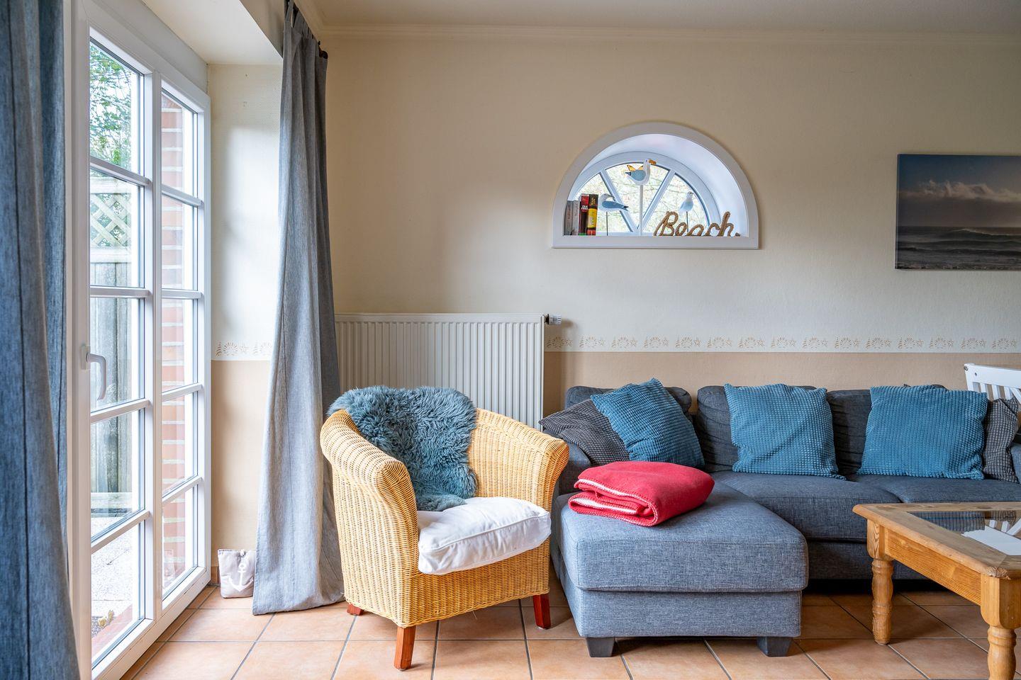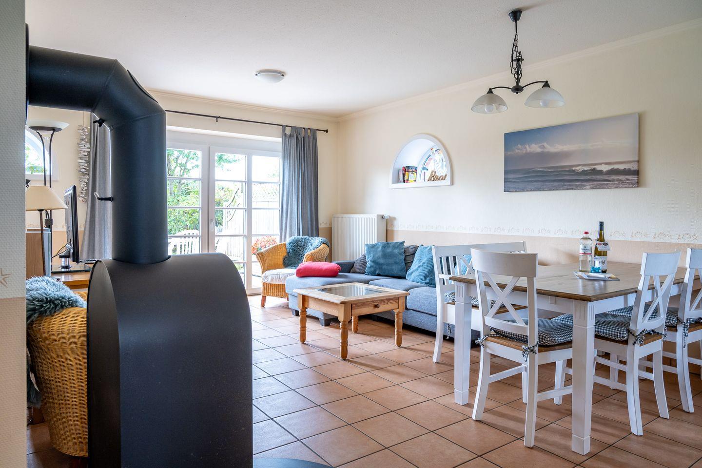 Im Erdgeschoss befinden sich der Wohn- und Essbereich mit offener Küche sowie ein Duschbad. Über den Wohnbereich gelangen Sie direkt auf die eigene Terrasse und in den Garten. Der dänische Ofen im Wohnbereich sorgt auch an kühleren Tagen für eine angenehme Atmosphäre.