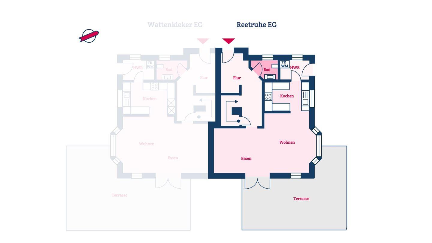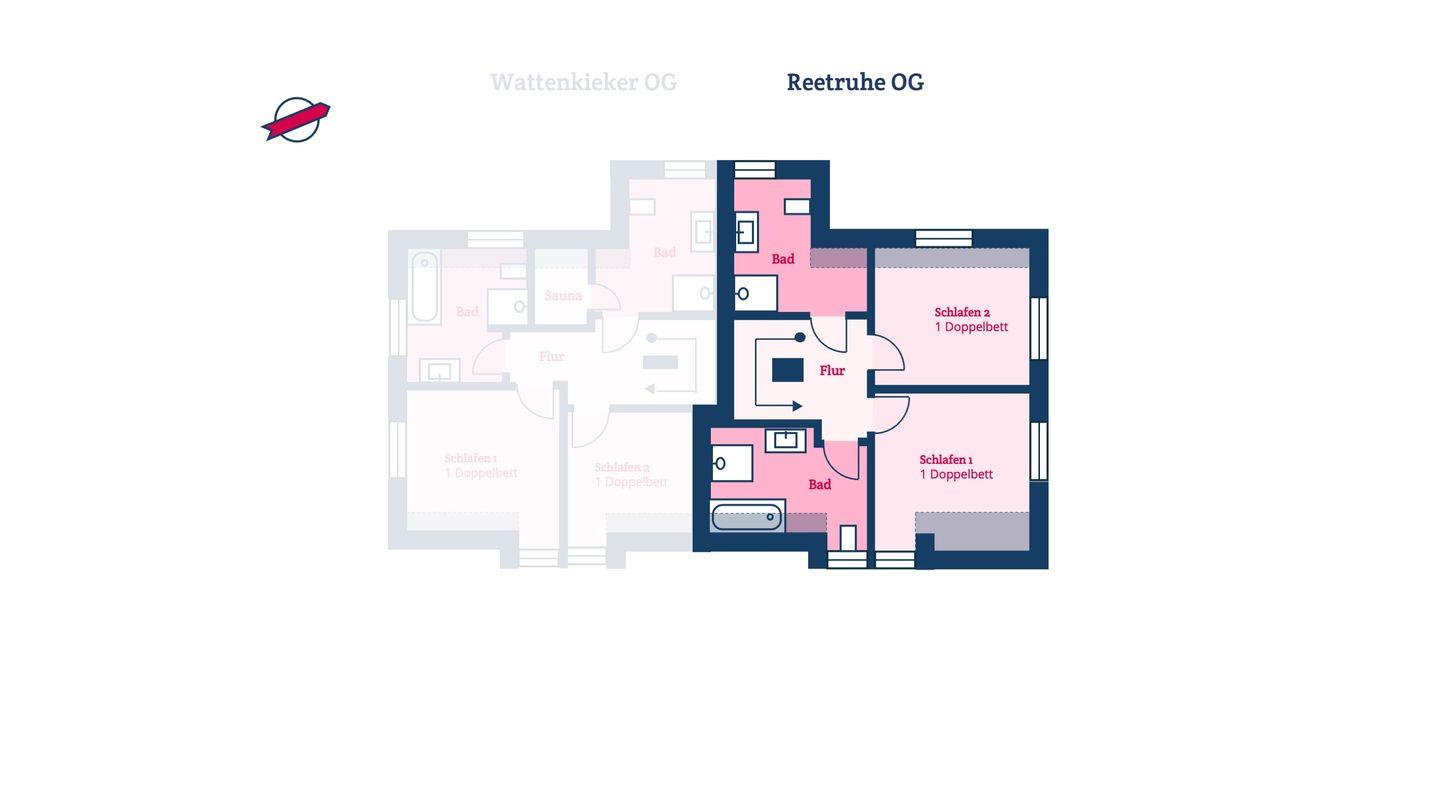 Die reetgedeckte Ferienhaushälfte Reetruhe verfügt über 2 Schlafzimmer, 2 Bäder und 1 Gäste-WC und bietet somit komfortabel Platz für bis zu 4 Personen zuzüglich einer Kleinkinderaufbettung. Auch bis zu 2 Hunde sind herzlich willkommen.