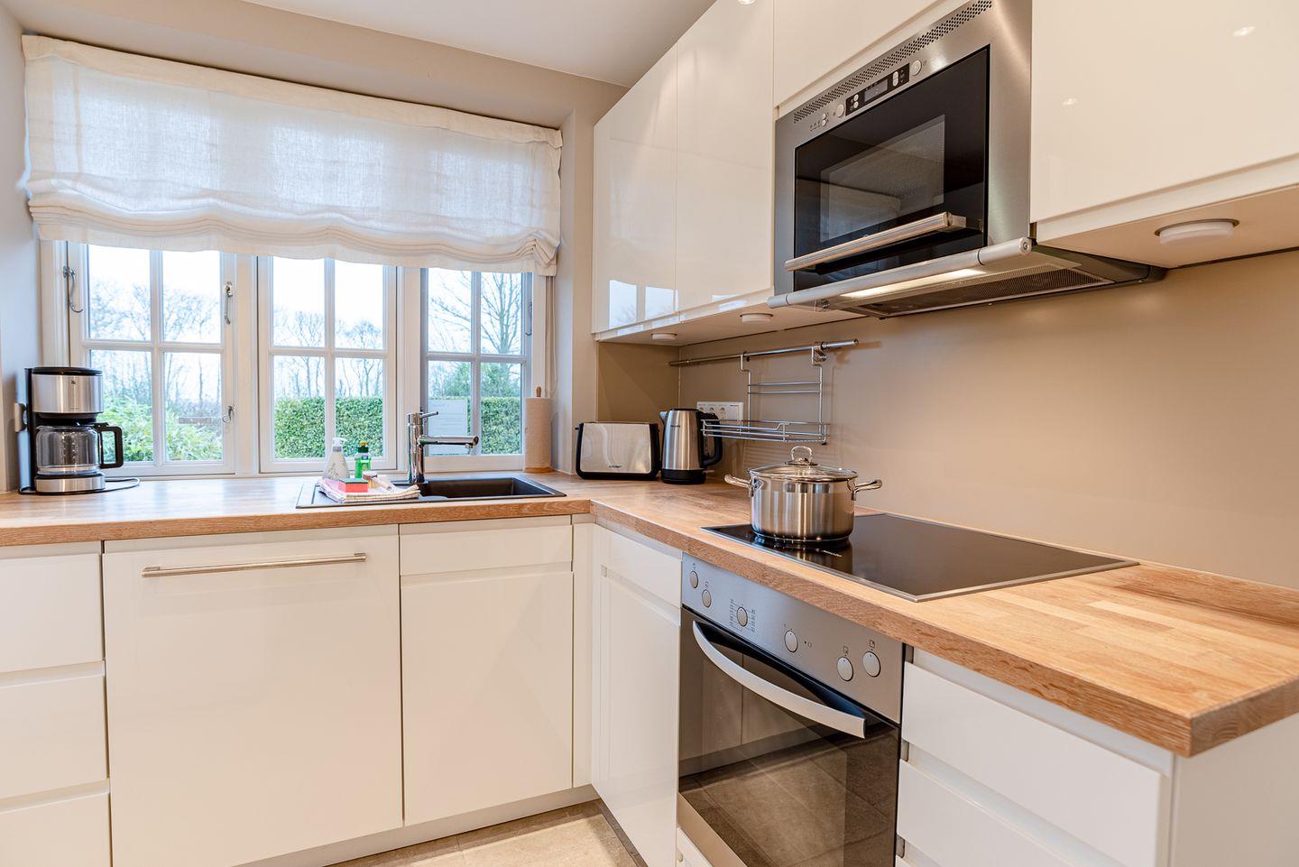 Im Erdgeschoss der Ferienwohnung befindet sich der großzügige Wohn-, Ess- und Küchenbereich mit direktem Zugang zur Terrasse, ein Badezimmer mit bodengleicher Dusche sowie eine winzige Waschküche, in welcher Waschmaschine und Trockner zu finden sind.