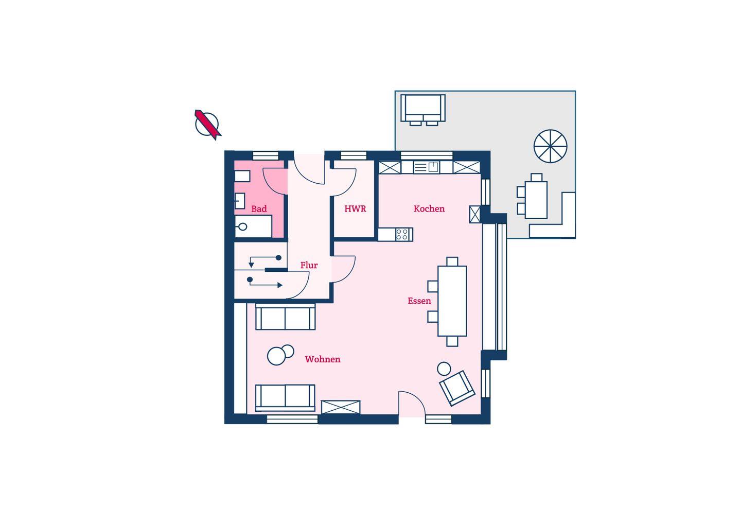 Im Erdgeschoss befindet sich das großzügige Wohn-/Esszimmer mit offener Küche und direktem Terrassenzugang. Zudem ist ein Bad mit bodengleicher Dusche im EG vorhanden.