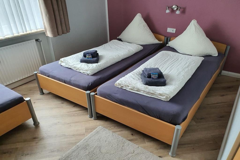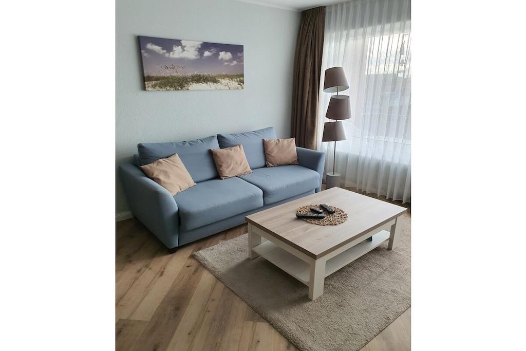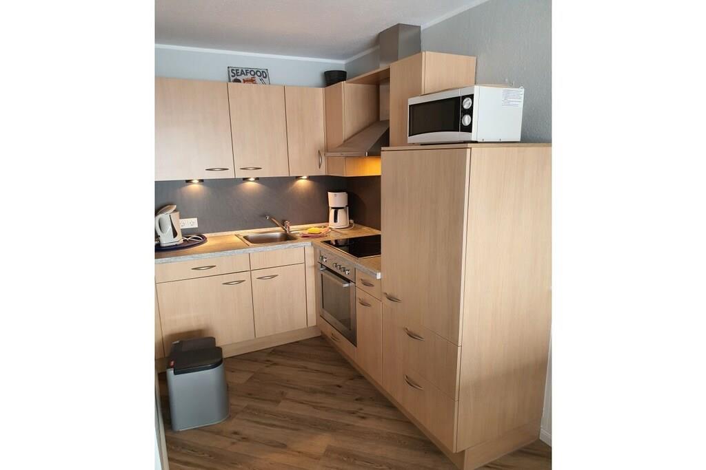 Herzlich Willkommen in unserer 2019 renovierten, hochwertig eingerichteten Ferienwohnung auf Borkum. Ihre Wohung befindet sich im 2.OG der Holidayresidenz. Im Schlafzimmer finden Sie drei Einzelbetten ( 0,90x2,00m, ohne Probleme zusammenstellbar ). Über einen kleinen Flur gelangen Sie in das Wohn- Esszimmer mit offener Küche. Das Wohnzimmer ist mit einem hochwertigen Sofa ausgestattet, welches sich mit einem Handgriff zu einem weiteren Bett mit Lattenrost und Matratze umklappen lässt. Ein Flatscreen, DVD-Player und Stereoanlage sind selbstverständlich vorhanden. Die offene Küche verfügt über Backofen, Mikrowelle und alle notwendige E-geräte. Vom Balkon aus haben Sie einen wunderbaren Blick auf die Pferdewiesen und den neuen Leuchtturm. Ein Parkplatz, der Kinderspielplatz und ein Tischtenniskeller runden das Angebot ab