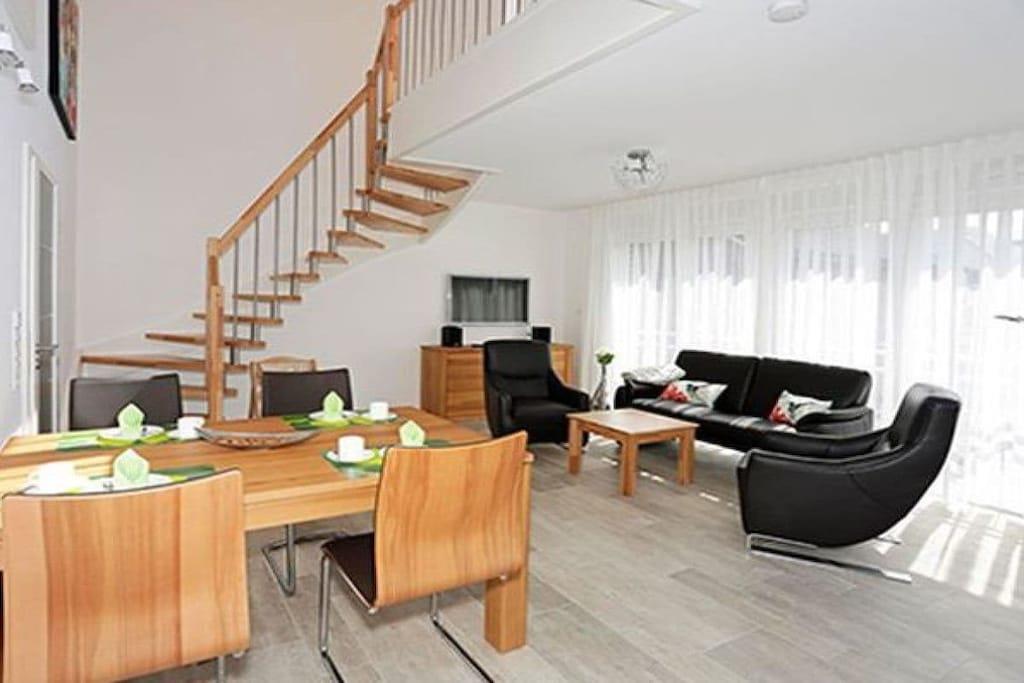 På 1. etage: (soveværelse(, , dobbeltseng, Fjernsyn)) Loft: (soveværelse(, , dobbeltseng, Fjernsyn)) , Køkken(, , tekøkken, kogeplade, elkedel, brødrister, kaffemaskine, ovn, mikrobølgeovn, opvaskemaskine , køleskab), stue / spisestue(, , Fjernsyn, spisebord, DVD-afspiller, stereoanlæg), badeværelse(, toilet, bruser, håndvask), badeværelse(, toilet, bruser, håndvask), Internetadgang, Internetadgang, tørretumbler, vaskemaskine, balkon(havemøbler), varme, parkering, liggestole(havemøbler)