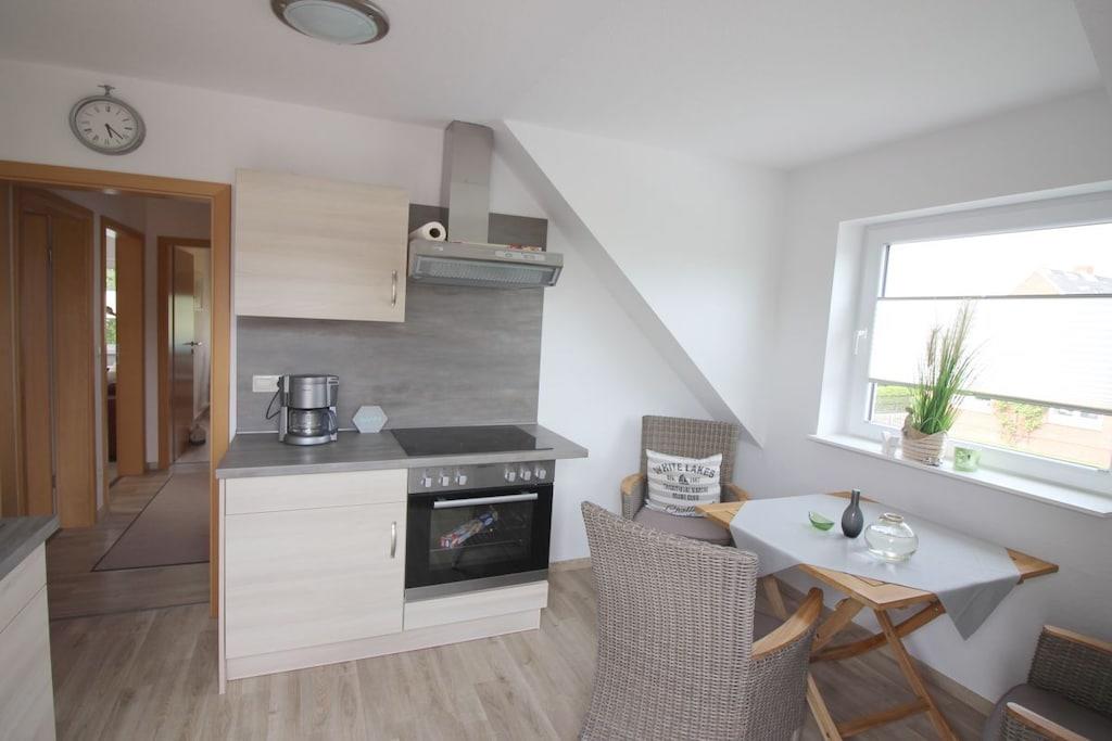 Unsere Ferienwohnung lässt keine Wünsche offen und garantiert durch ihre Ausstattung einen gelungenen Aufenthalt. Teilrenovierung im März 2019. Die neuwertige, moderne Einbauküche ist ausgestattet mit Ceranfeld, Mikrowelle, Backofen, Spülmaschine, Kaffeeautomat, Toaster und Kühlschrank. Das hochwertig eingerichtete Wohnzimmer lädt zum Verweilen ein. Selbstverständlich bieten wir einen kostenlosen WLAN Zugang. Im Wohlfühl-Badezimmer mit moderner Dusche sind Handtücher selbstverständlich vorhanden. Auf der traumhaften, großzügigen Dachterrasse mit Strandkorb, moderner Sitzgruppe, zwei Liegen, Markise und einem Elektro-Webergrill können Sie Ihren Urlaub genießen. Freuen Sie sich schon jetzt auf einen wunderschönen und erholsamen Urlaub bei uns.