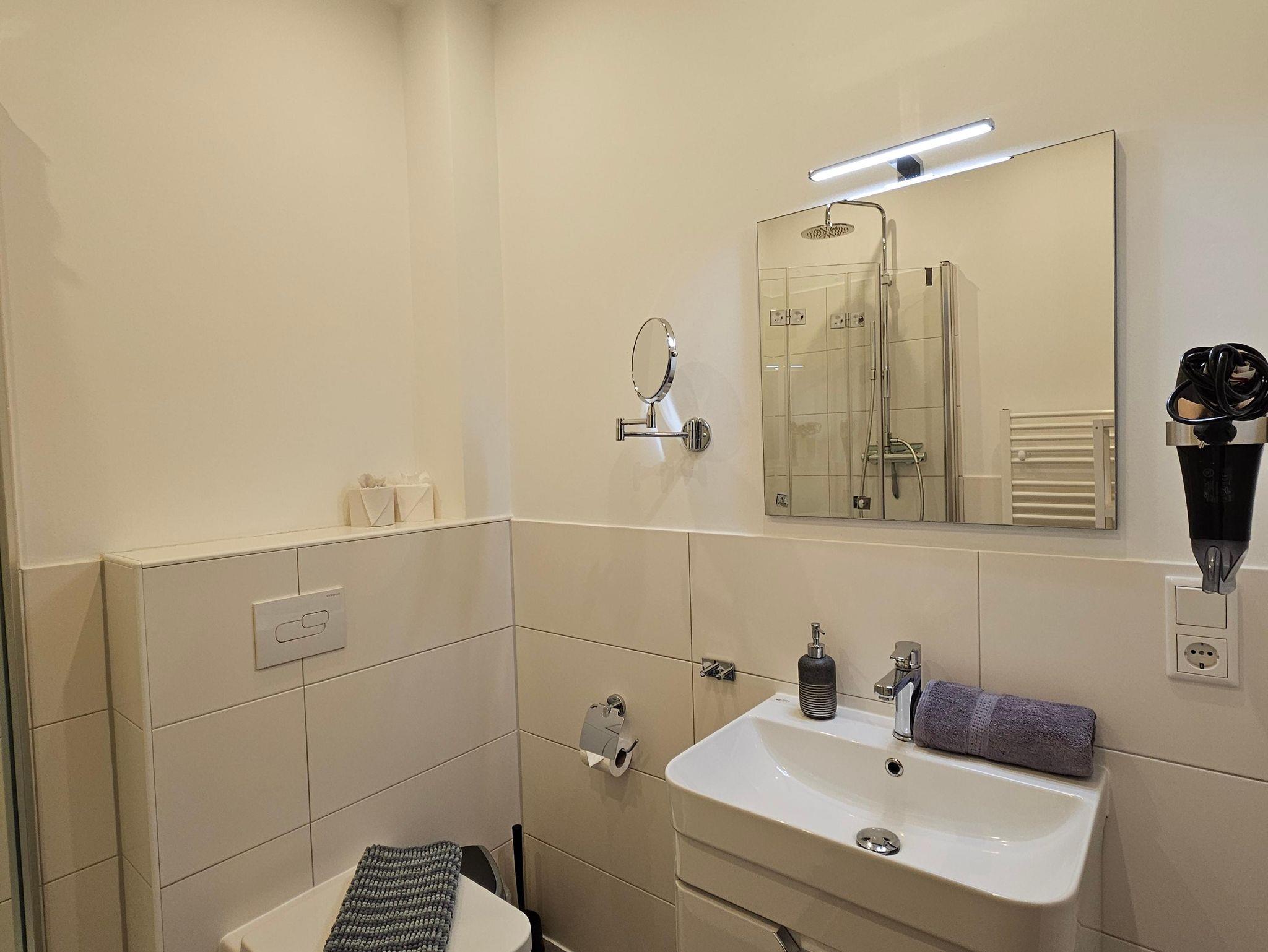 - Badezimmer mit Kosmetikspiegel und Haartrockner