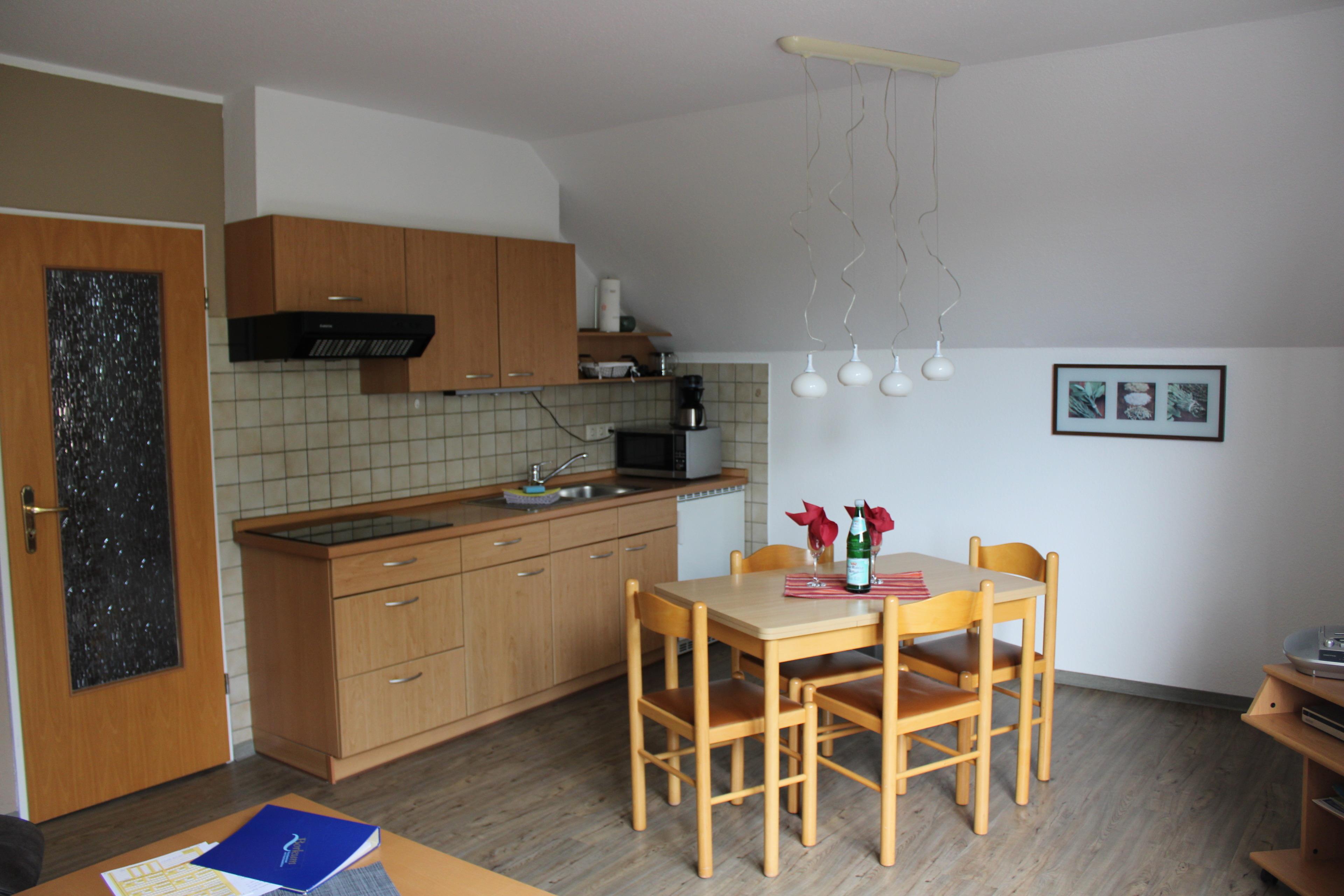 gemütlicher Wohnraum mit Küchenzeile (Herd, Mikrowelle, Wasserkocher, Toaster, Kaffeemaschine)