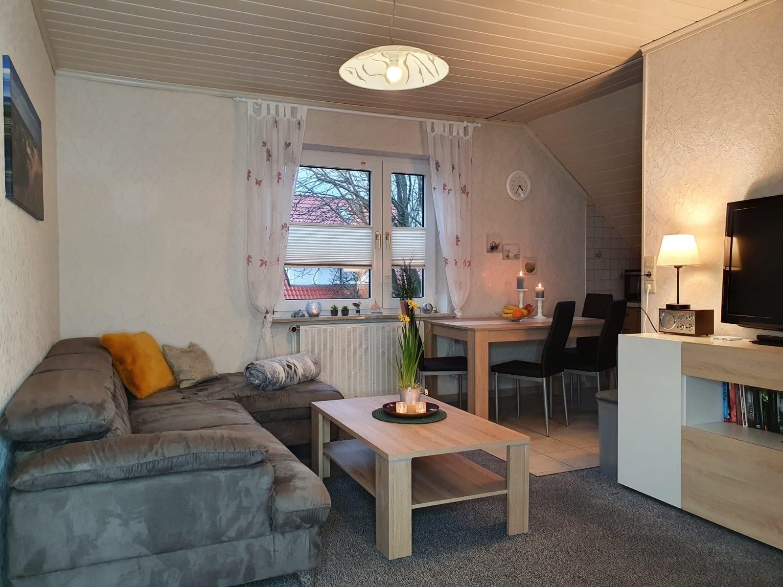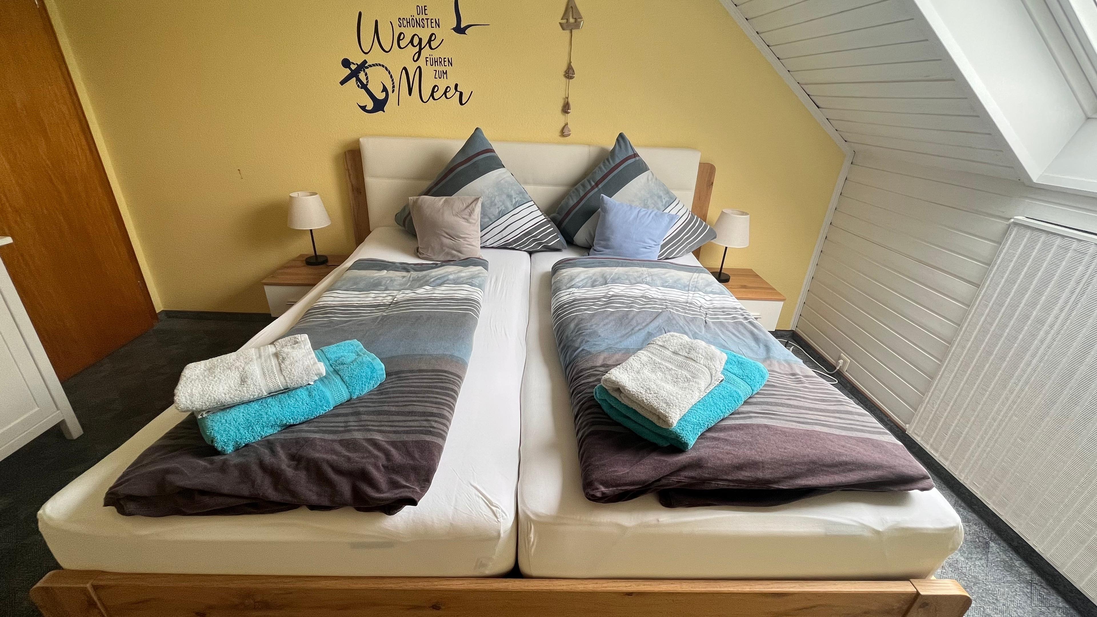 Unsere schöne drei Zimmer Ferienwohnung befindet sich in der ersten Etage vom Huus Borkum. Beim betreten der Wohnung kommen Sie in den großzügigen Wohn- Essbereich welcher mit seiner Wohnlandschaft zum gemütlichen verweilen einlädt. Vom Eingangsbereich aus gelangen Sie auch in das erste Schlafzimmer welches mit einem großzügigem Doppelbett ausgestattet ist. Durch dieses Zimmer gelangen Sie auch zum zweiten Schlafzimmer wo Sie zwei Einzelbetten vorfinden.