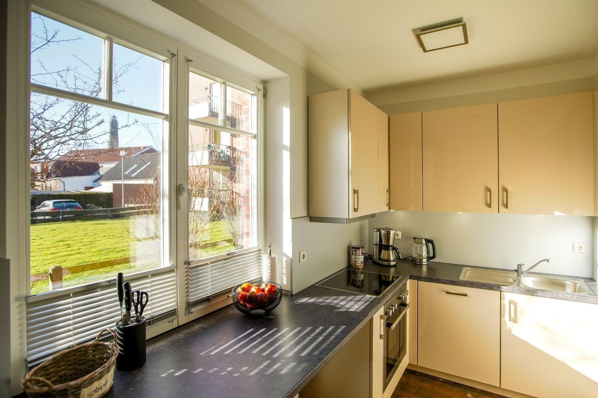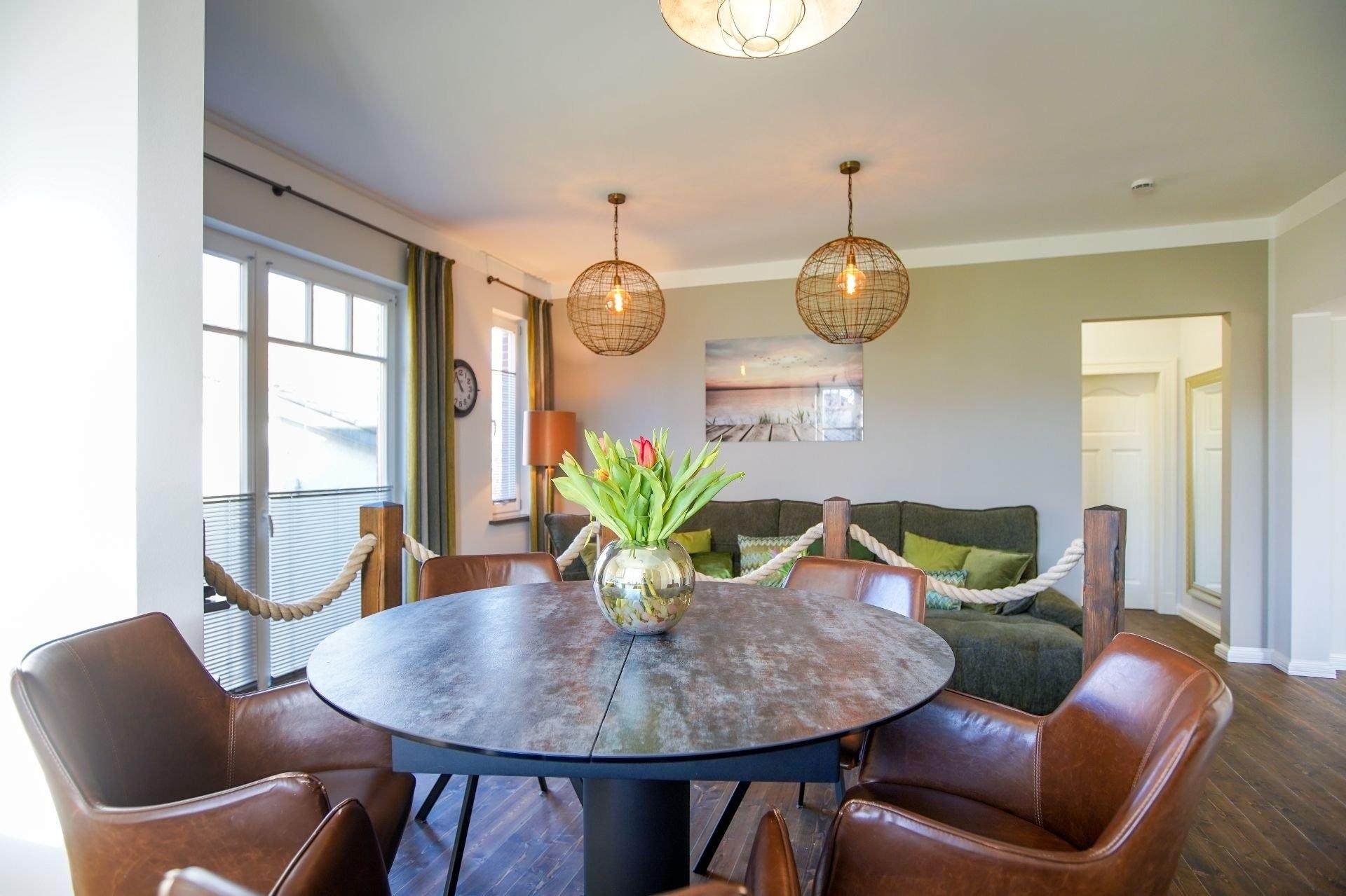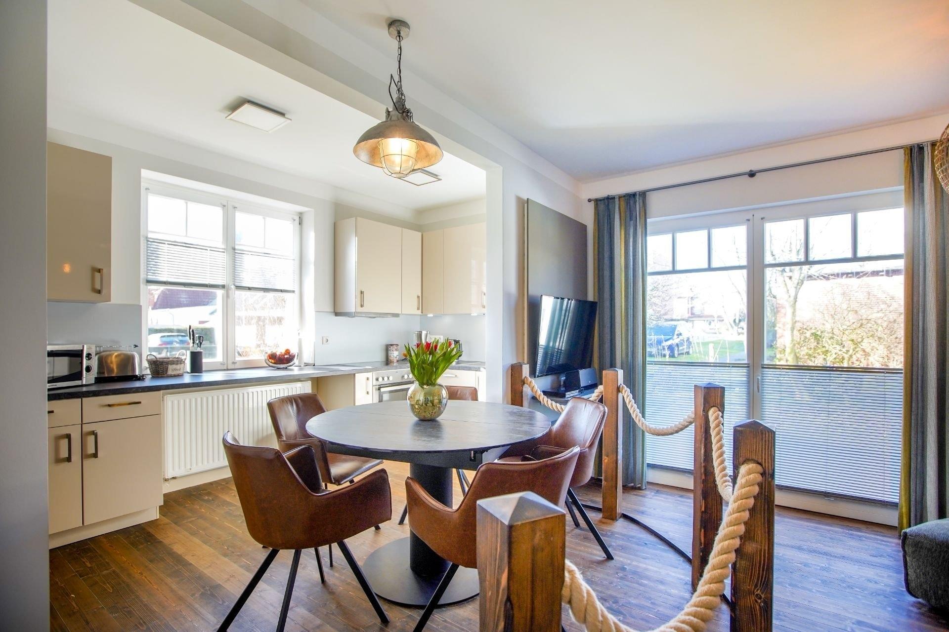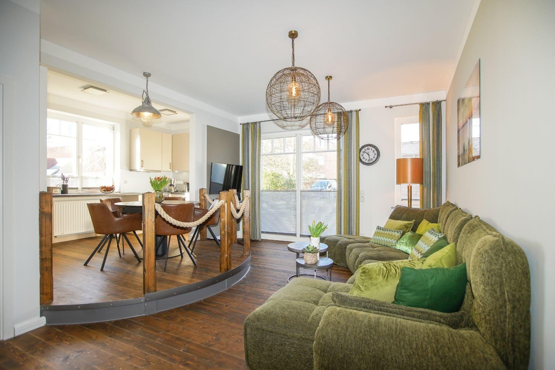 Ferienwohnung Lina empfängt Sie mit stilvollem, individuellen Ambiente und originellen Deko-Objekten. Der kombinierte Wohn-Essbereich bietet Ihnen neben einem bequemen Sofa, TV mit Blu-ray- und Musikanlage mit iPod-Station auch einen etwas erhöhten Essplatz sowie eine komplett ausgestattete, schöne Küche.