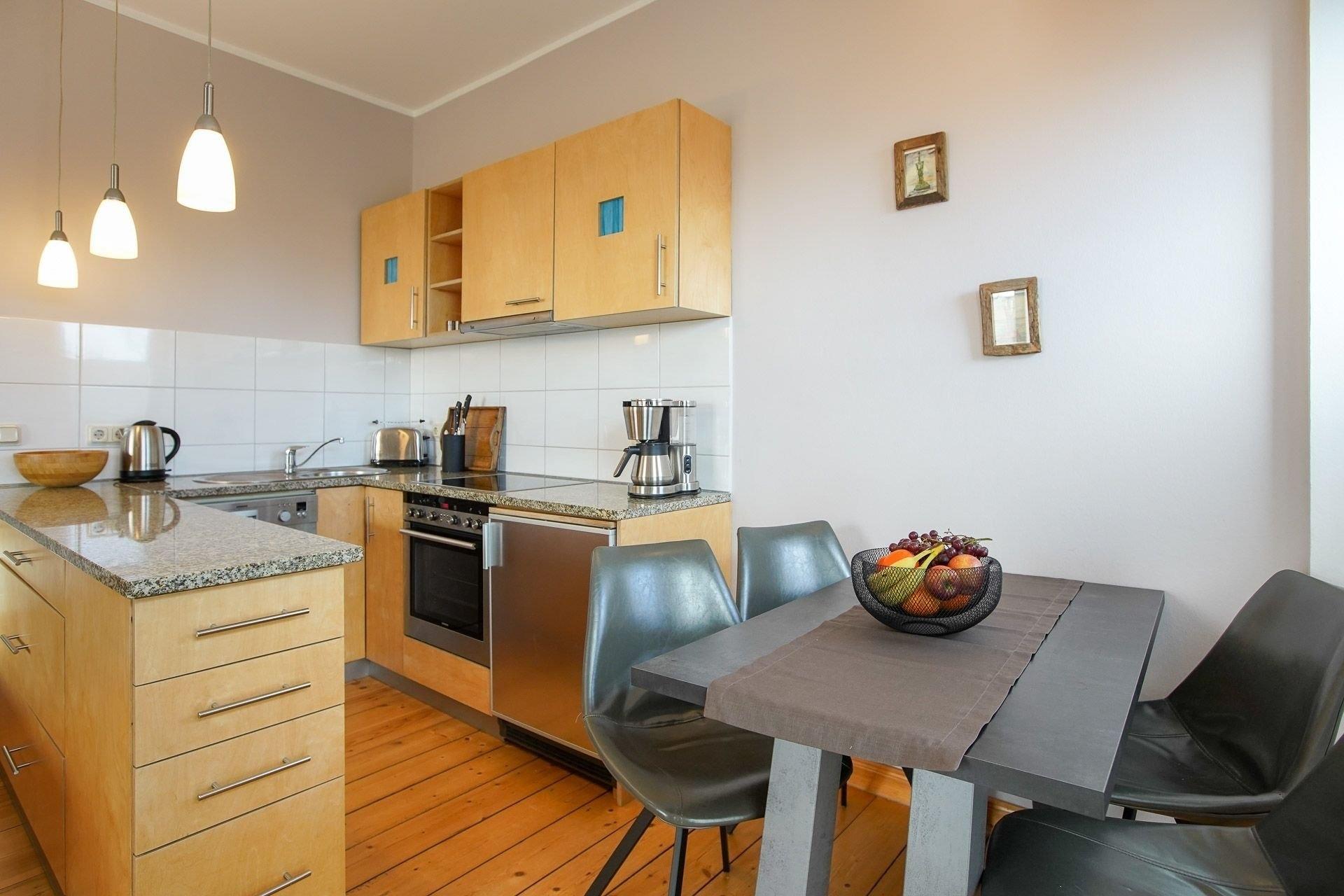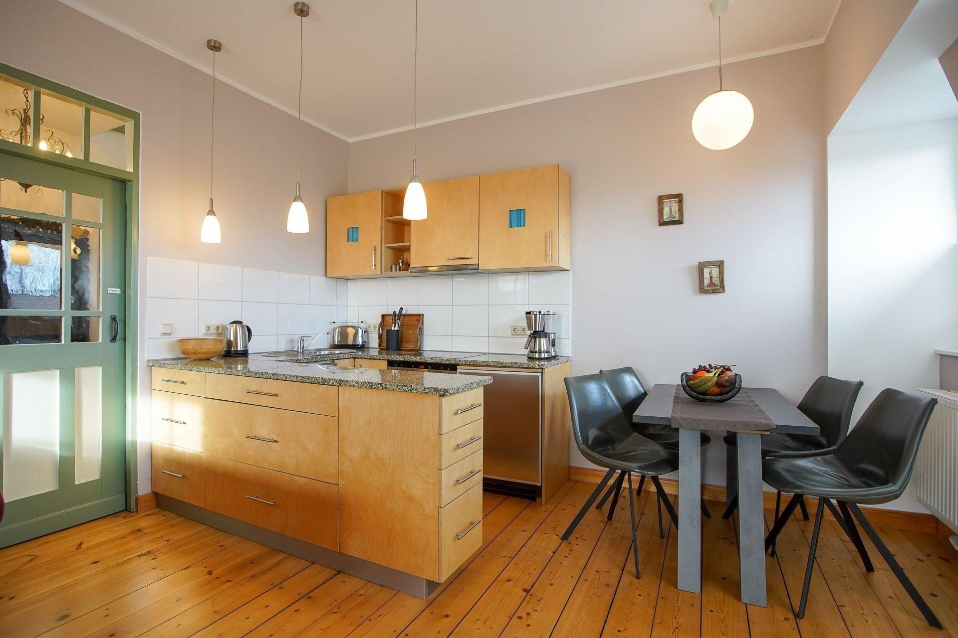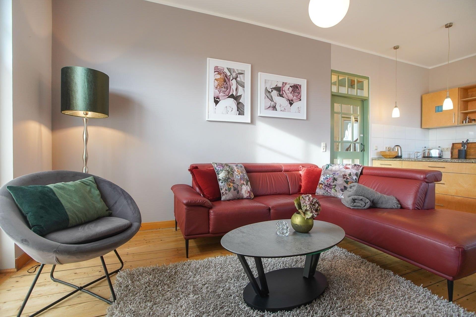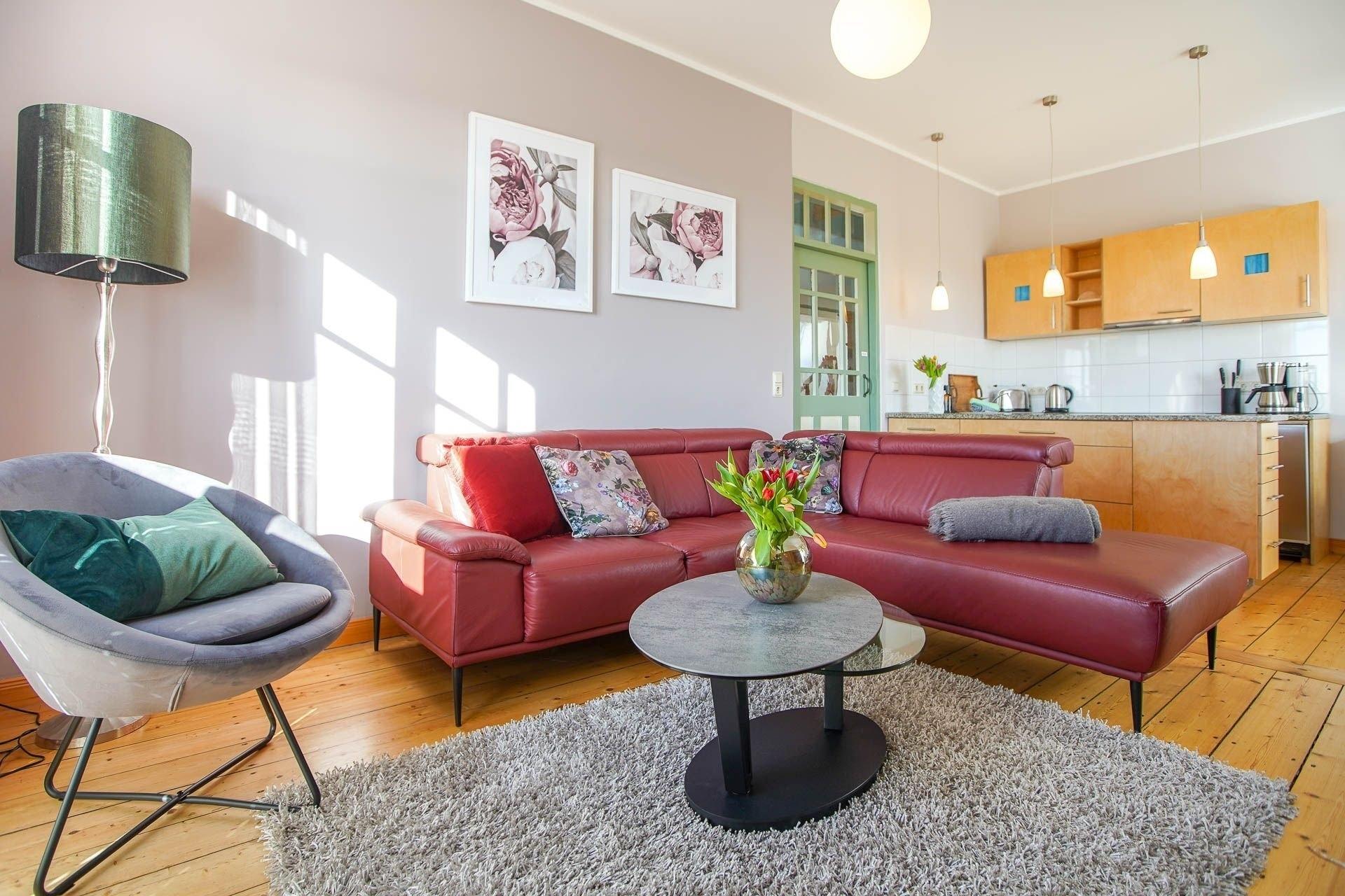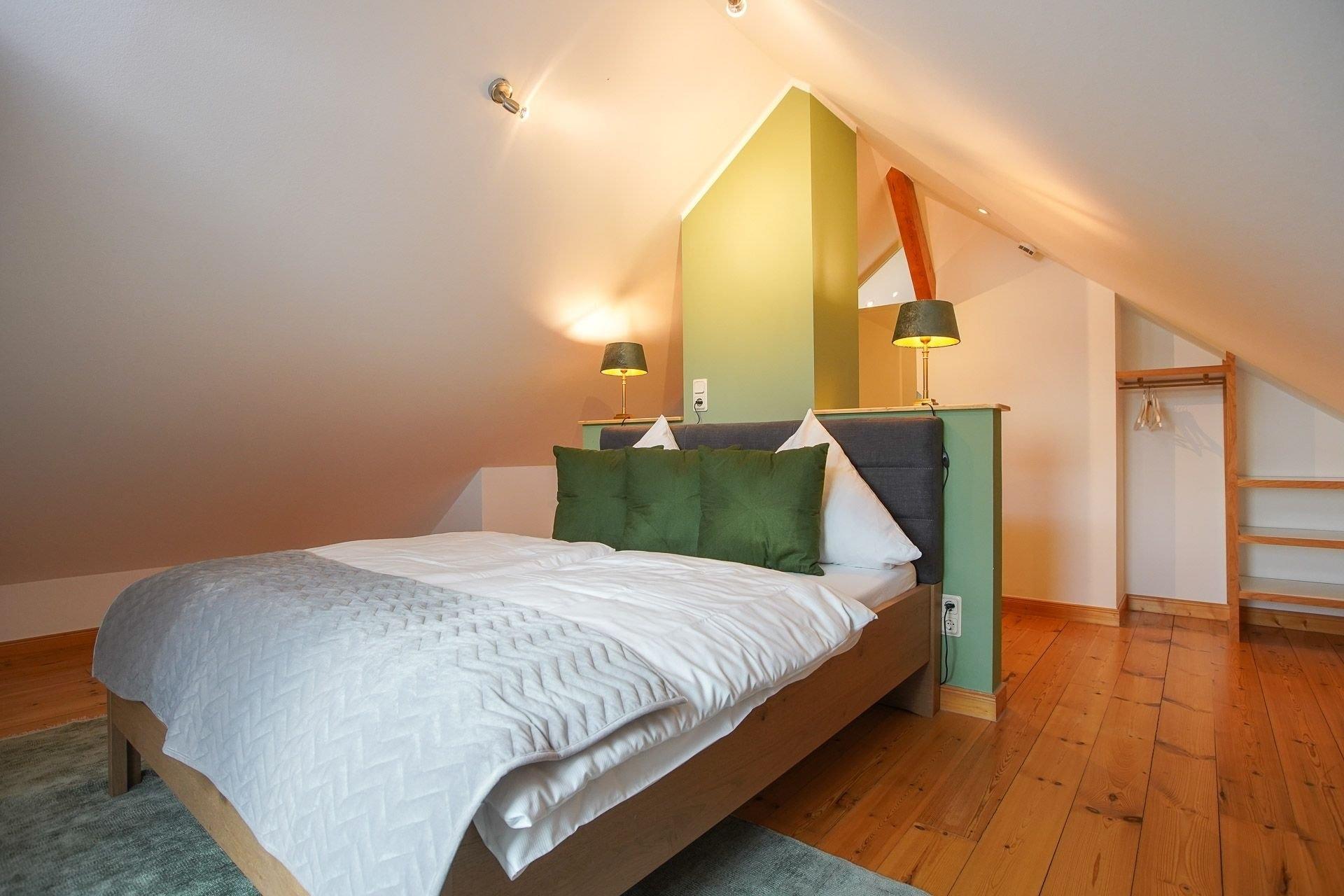 Die liebevolle Einrichtung ist ein Mix aus Modernem und Antiquitäten und sorgt für ein herrliches Ambiente. Im unteren Bereich der Maisonettenwohnung erwartet Sie der große Wohnbereich mit Sofa, TV und Blue-Ray-Player zum entspannen. Außerdem die Küche mit Geschirrspüler und Ceran-Kochfeld sowie ein Schlafzimmer mit King-Size-Doppelbett und das Bad mit freistehender Badewanne, Dusche und WC.