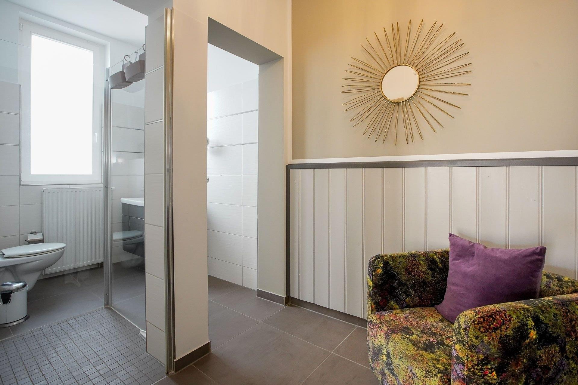 In dem geräumigen und gut gestalteten Badezimmer findet sich eine große Dusche. Die gesamte Einrichtung ist ein gelungener Mix aus aktueller und antiker Möblierung was einen besonderen Charme verleiht.