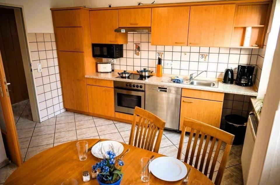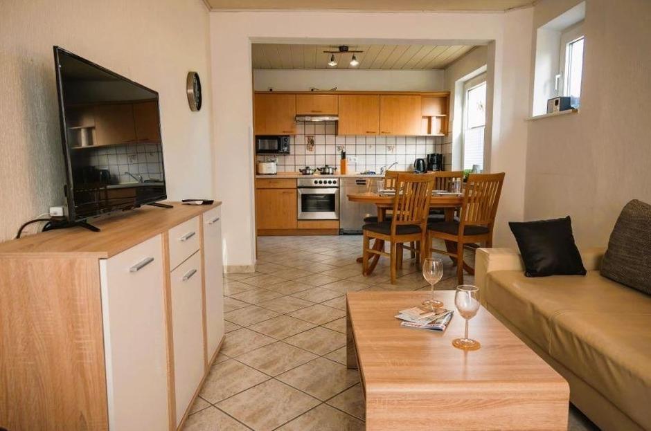 Der geräumige Wohn-Essbereich mit Küchenzeile bietet ausreichend Platz zum Verweilen und Entspannen. Die hochwertige Einbauküche verfügt über eine Mikrowelle, Backofen, Ceranfeld, Geschirrspüler, Wasserkocher, Kaffeemaschine und Toaster.