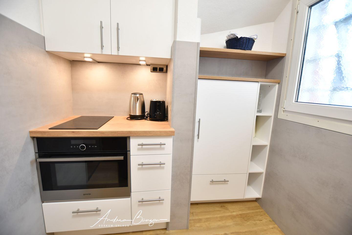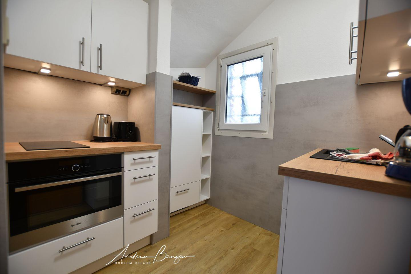 Im Erdgeschoß befinden sich das gemütliche Wohnzimmer sowie die Küche mit Backofen und Ceran-Kochfeld. in der ersten Etage liegt das separate Schlafzimmer mit Doppelbett und dem Bad mit Dusche und WC.