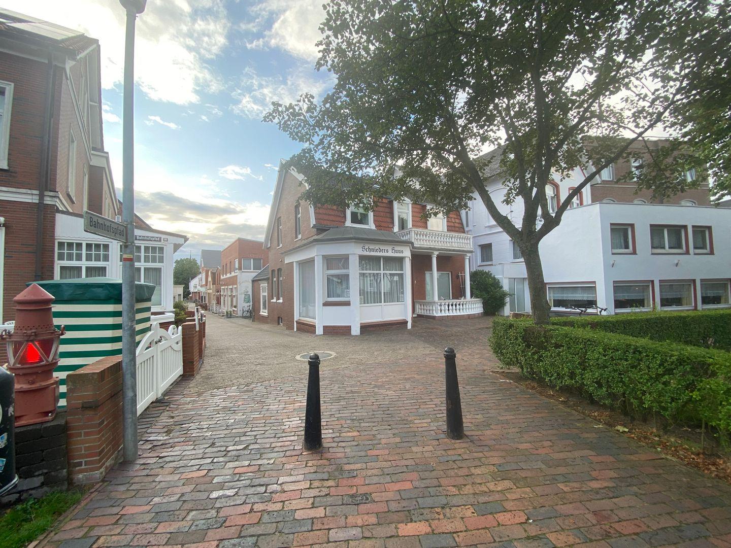 Die Ferienwohnung liegt am Georg-Schütte-Platz im Ortskern von Borkum mit fußläufig erreichbaren Restaurants und Einkaufsmöglichkeiten. Die Strandpromenade und der Hauptbadestrand sind in 5min zu Fuß zu erreichen, der Bahnhof der Inselbahn liegt in unmittelbarer Nähe.