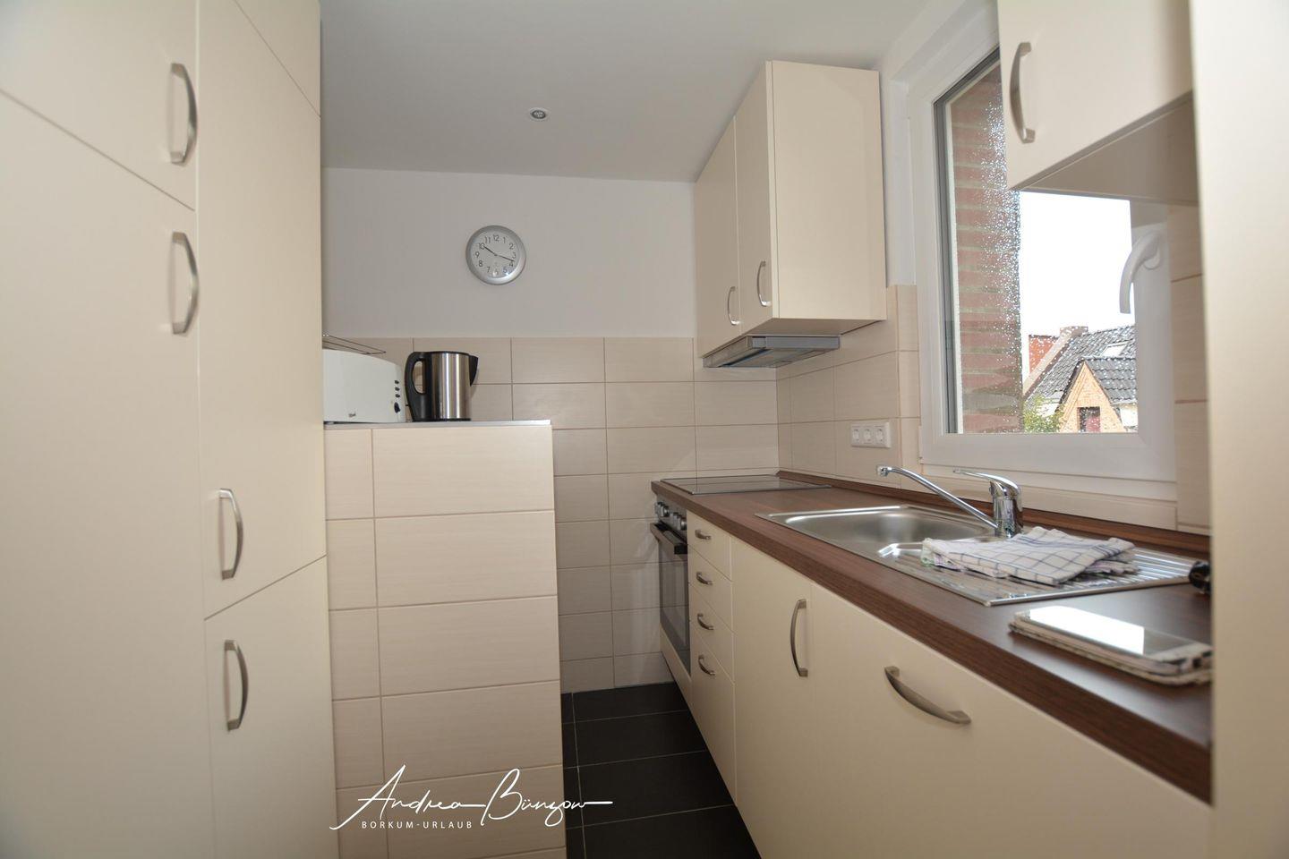 Diese hübsche, soeben neu renovierte Wohnung hat einen großen Wohnraum mit Schrankbetten, angrenzender Küche, ausgestattet mit Backofen, Ceranfeld, Kühlschrank, Spülmaschine, Kaffeemaschine, Wasserkocher, etc. und ausreichend Kochgeschirr. Schlafzimmer mit Doppelbett und Bad mit Dusche und WC. Der Bodenbelag ist Kunststoff-Laminat, die tierfreie Wohnung allergikerfreundlich. Besonders hervorzuheben ist die sehr zentrale Lage in der Nähe des Bahnhofes und aller wichtigen Einrichtungen wie Gezeitenland und Kulturinsel. Zum Strand sind es nur 650m.