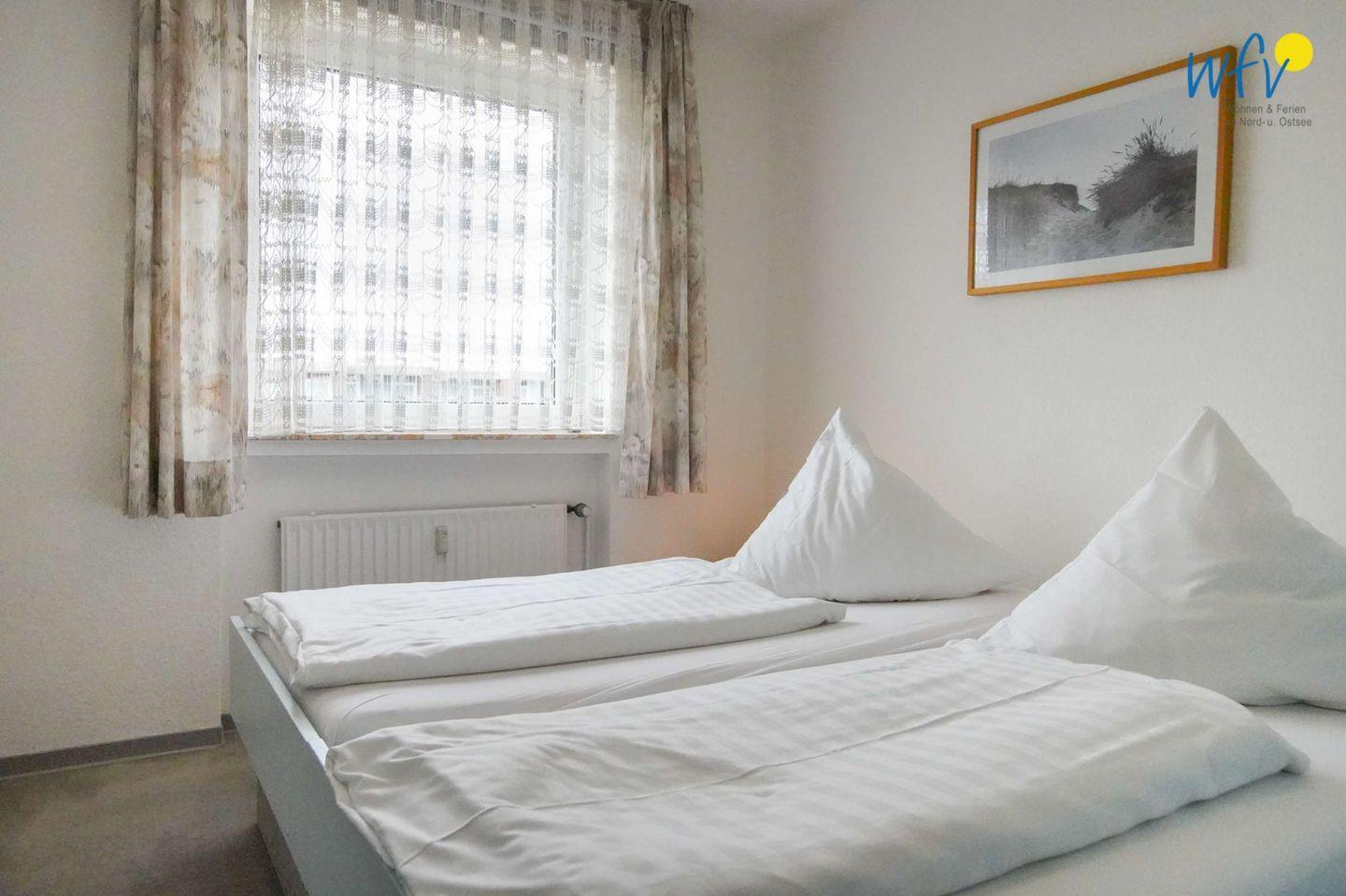 Das separate Schlafzimmer der Ferienwohnung auf Borkum ist mit einem Doppelbett (90x200 cm) und einem Kleiderschrank eingerichtet. Für eine angenehme Nachtruhe bestehen selbstverständlich Verdunkelungsmöglichkeiten.