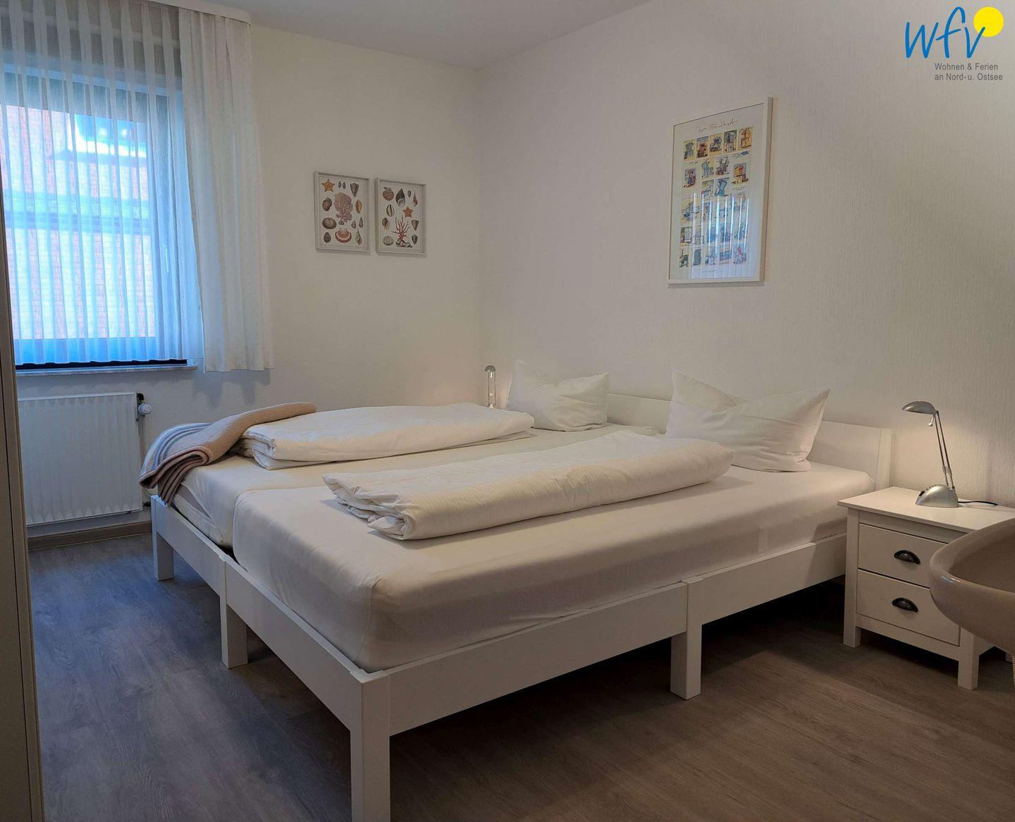 Das separate Schlafzimmer der Ferienwohnung "Gartenblick" ist mit einem Doppelbett (180 x 200 cm) und einem großen Kleiderschrank eingerichtet. Zudem befindet sich im Raum ein Waschbecken. Die Bettdecken/Kissen sind mit Synthetik/Federn gefüllt.