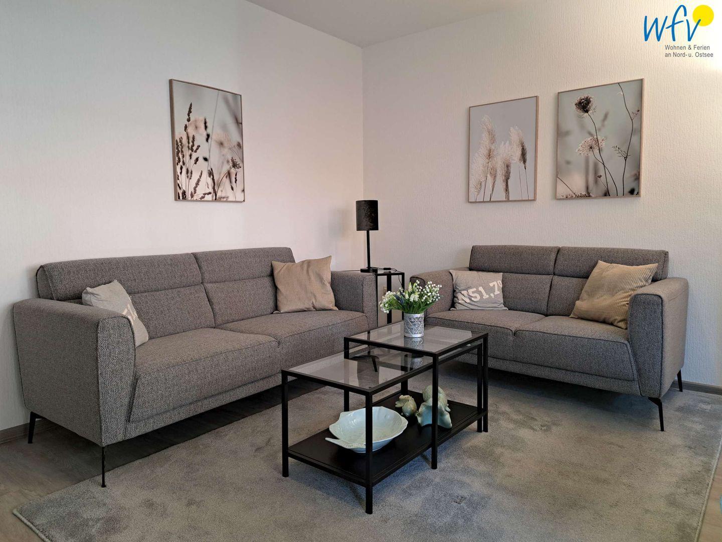 Ob nach dem Strandtag oder der Fahrradtour - in dem gemütlichen Wohnraum mit bequemer Couchecke, TV (32 Zoll) und Radio können Sie ausgiebig relaxen. Für gemeinsame Mahlzeiten ist ein kleiner Essplatz am Fenster vorhanden.
