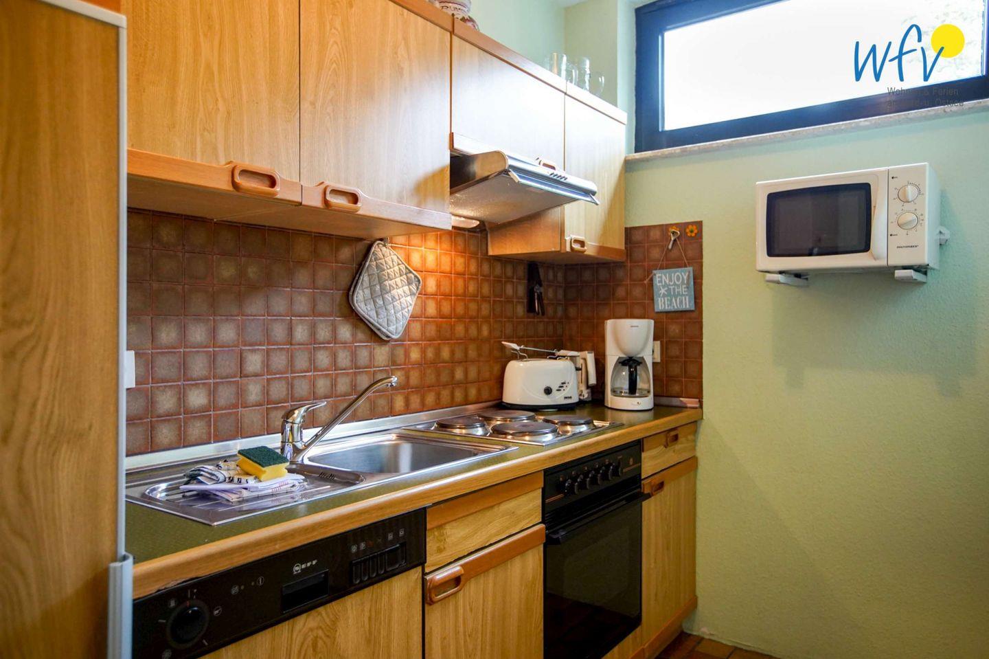 Eine bequeme Selbstverpflegung in Ihrem Urlaub auf Borkum bietet Ihnen die komplett ausgestattete separate Küche - u.a. mit Herd, Backofen, Mikrowelle und Spülmaschine.