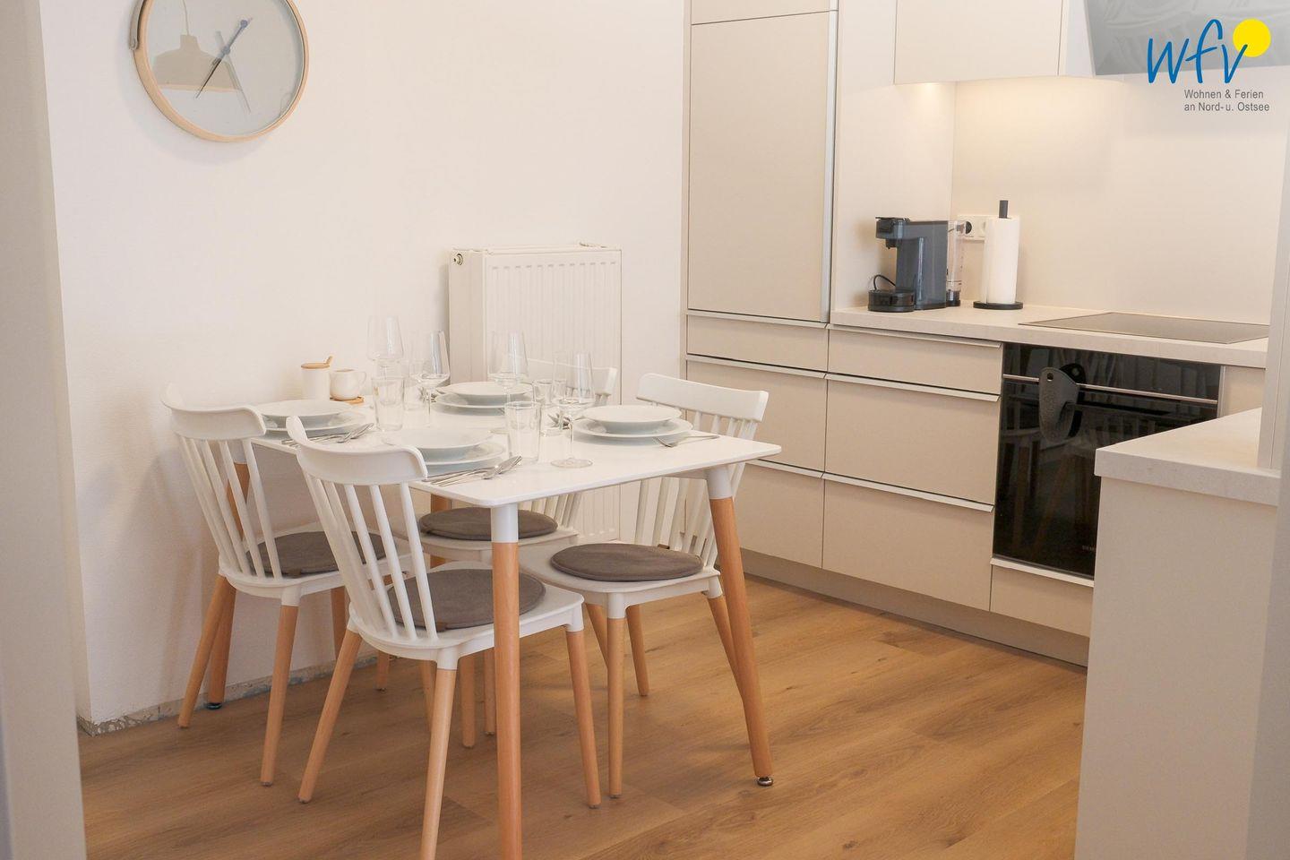 Im Wohnraum lädt ein Esstisch zum ausgiebigen Ferienfrühstück ein, das Sie bequem in der modernen Küche zubereiten können - u.a. mit hochwertigen Geräten wie Induktionsherd, Backofen und Spülmaschine. Kaffeeliebhaber haben die Wahl zwischen einer Filtermaschine und einem Vollautomaten - perfekt für den ersten entspannten Morgenkaffee am gemütlichen Küchentresen.