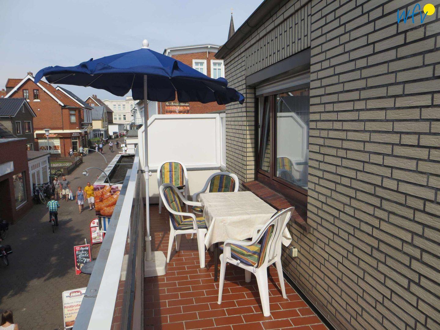 Sonne und frische Nordseeluft garantiert Ihnen der hübsche Balkon der Ferienwohnung! Es sich auf den Gartenmöbeln bequem zu machen, dem Inseltreiben zuzuschauen und Sonnenstrahlen zu tanken ist ein herrliches Urlaubsgefühl!