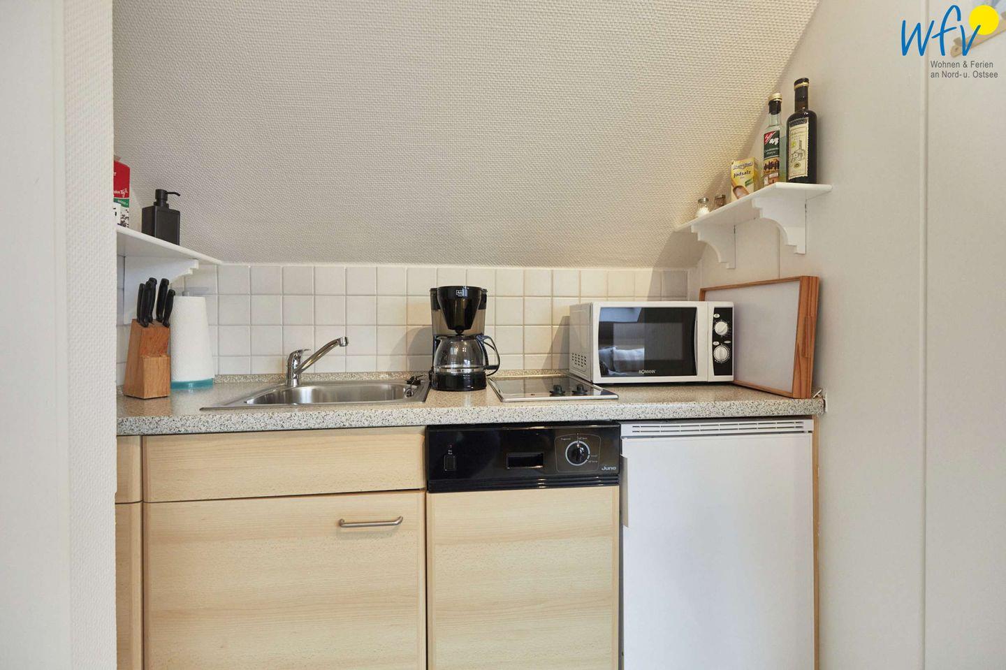 Das Ferienfrühstück sowie Snacks für zwischendurch oder kleine Mahlzeiten lassen sich in der Küchenzeile mit Zwei-Plattenherd, Mikrowelle und Kühlschrank gut zubereiten. Den Abwasch übernimmt die Spülmaschine.