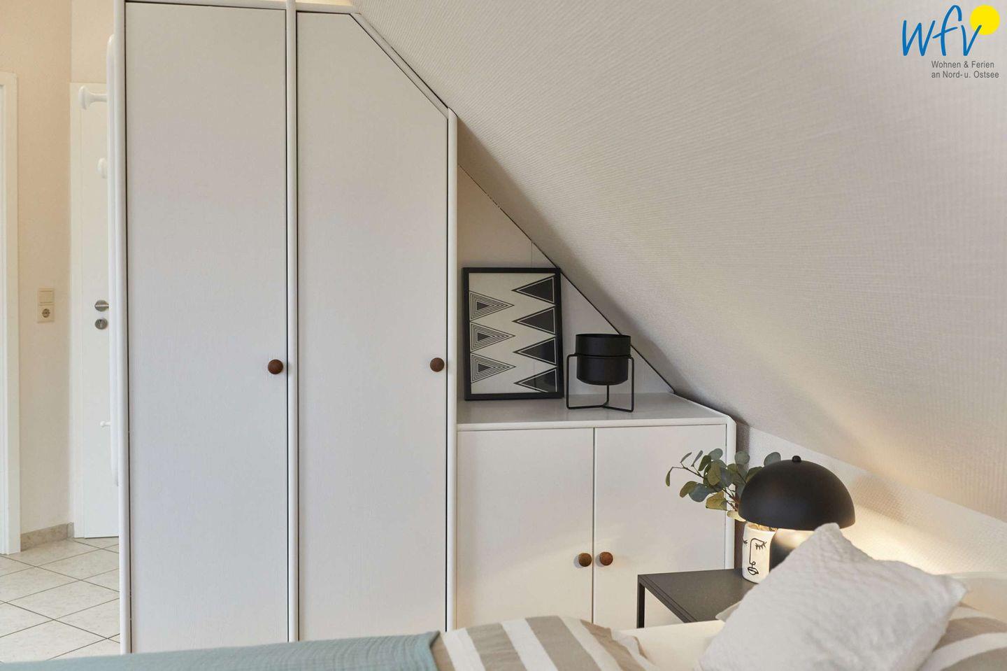 Zur angenehmen Nachtruhe lädt das komfortable Doppelbett (160 cm x 200 cm) ein. Nachttische mit Lämpchen ermöglichen gemütliche Lesestunden vor dem Einschlafen. Die Fenster können selbstverständlich verdunkelt werden. Für Ihre Urlaubsgarderobe ist ein geräumiger Kleiderschrank vorhanden.