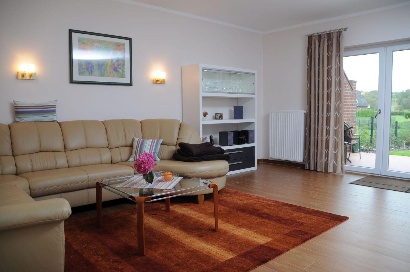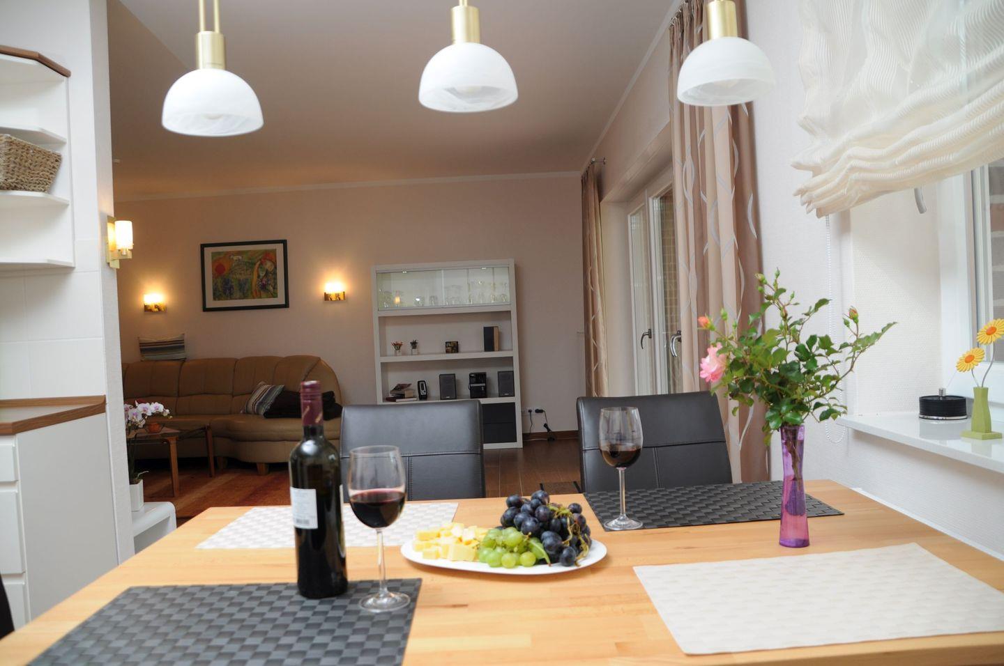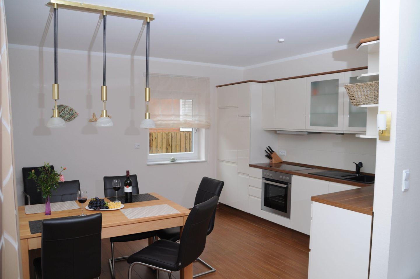 Die Wohnung selbst überzeugt durch eine gelungene Mischung aus Modernität und Gemütlichkeit. Die offene Küche ist mit hochwertigen Annehmlichkeiten ausgestattet, darunter ein Cerankochfeld, ein Backofen sowie eine Spülmaschine, die Ihren Aufenthalt noch bequemer machen. Zudem sind alle notwendigen Küchenutensilien vorhanden, sodass Sie Ihre Lieblingsgerichte zubereiten können. Der Essbereich lädt zum gemeinsamen Verweilen ein, während die gemütliche Sofaecke im Wohnbereich für entspannte Fernsehabende einlädt. Ein Fernseher, WLAN und ein Radio sorgen für Ihre Unterhaltung.