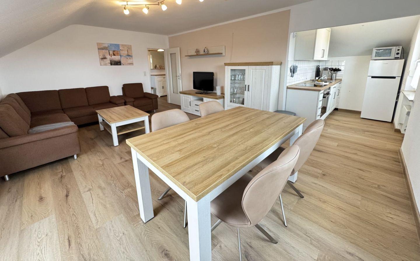 Der Wohnbereich ist einladend gestaltet und bietet eine große Sofaecke, einem Essbereich und der technischen Ausstattung wie WLAN und zwei Fernsehern alles für einen behaglichen Aufenthalt. Die Fenster sind mit Sichtschutz versehen, wodurch Sie ungestörte Ruhe und Privatsphäre genießen können.