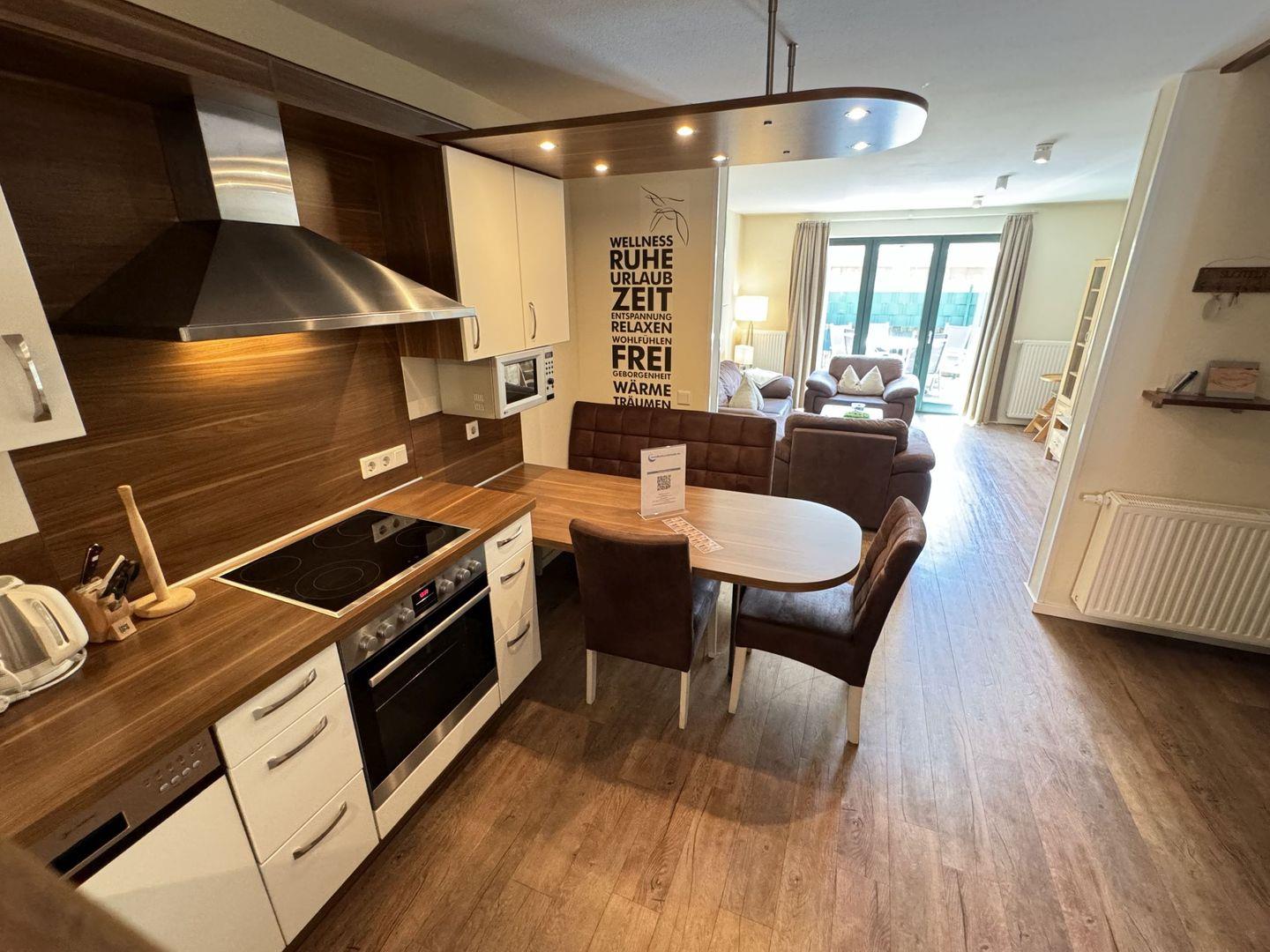 Das Haus verfügt über insgesamt vier Zimmer, darunter drei komfortable Schlafzimmer, die mit einem Vinylboden ausgestattet sind. Für Familien mit kleinen Kindern ist Fiete besonders geeignet, da sowohl ein Babybett als auch ein Kindertoilettensitz zur Verfügung stehen. Zudem wurde ein Treppengitter installiert, um die Sicherheit der Kleinen zu gewährleisten. Die offene, gut ausgestattete Küche mit modernen Geräten, wie einem Cerankochfeld, einem Backofen, einer Mikrowelle und einer Spülmaschine, lädt zum gemeinsamen Kochen und gemütlichen Beisammensein ein. Ein Esstisch bietet genügend Platz, um gemeinsam zu speisen oder Spieleabend zu verbringen.