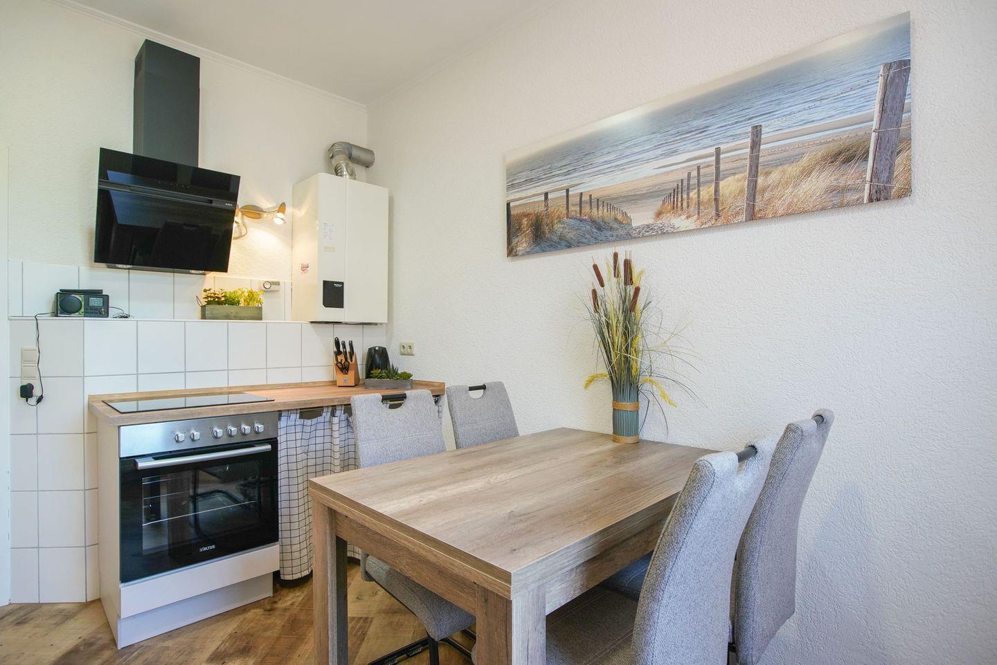 Das Ferienhaus ist komplett mit einer geschlossenen Küche ausgestattet, die mit modernen Annehmlichkeiten wie einem Cerankochfeld, Backofen, Kühlschrank, Gefrierfach und einer Geschirrspülmaschine ausgestattet ist. Für einen genussvollen Start in den Tag sorgt die Kaffeemaschine, während Sie mit dem Toaster und dem Wasserkocher kleine Snacks oder Getränke zubereiten können. An einem großzügigen Esstisch können Sie gemeinsam dinieren und die Zeit miteinander genießen.