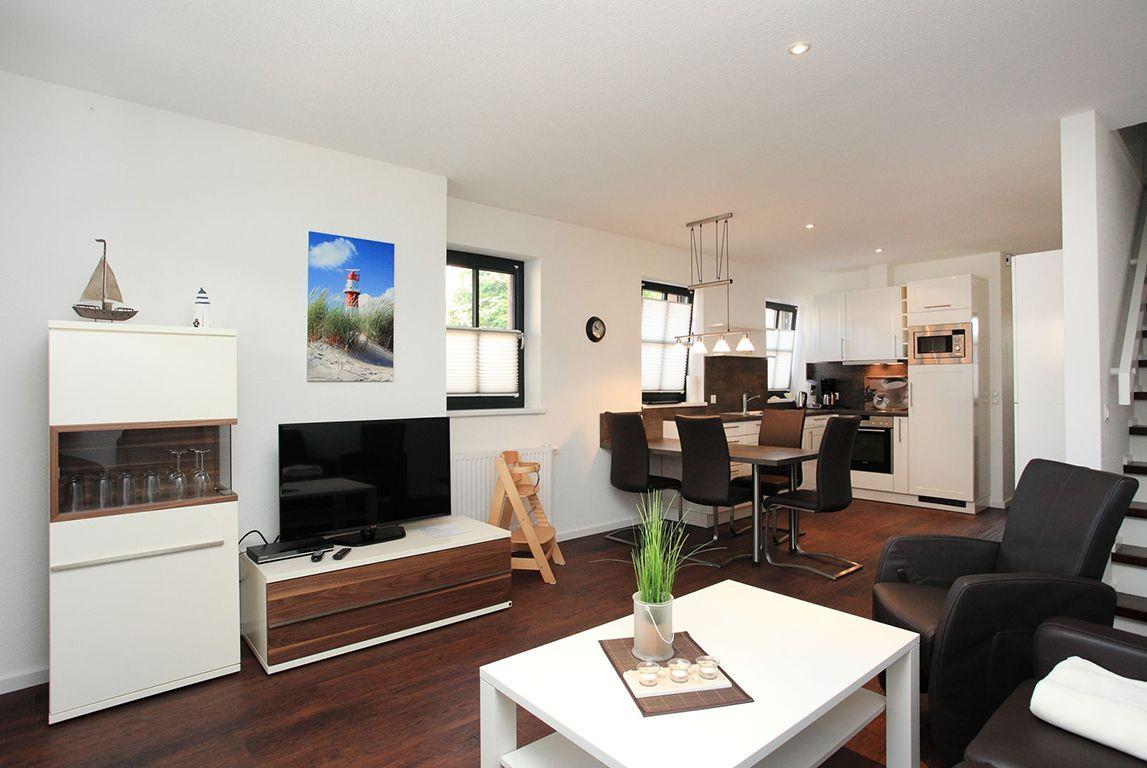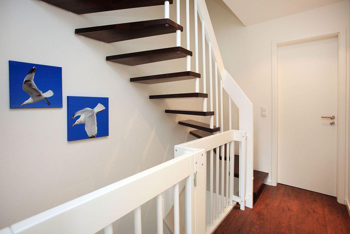 Die knapp 90qm große, 5-Sterne zertifizierte Wohnung erstreckt sich auf insgesamt drei Etagen und bietet so jede Menge Platz für bis zu vier Personen. Am Erdgeschoss schließt eine nach Süd-Westen ausgerichtete Terrasse an, die zum Entspannen und Kraft tanken einlädt. Zusätzlich verfügt die Wohnung im zweiten Obergeschoss über eine Sauna (Gebühr). Auf allen Etagen befinden sich ferner vollausgestattete Duschbadezimmer.