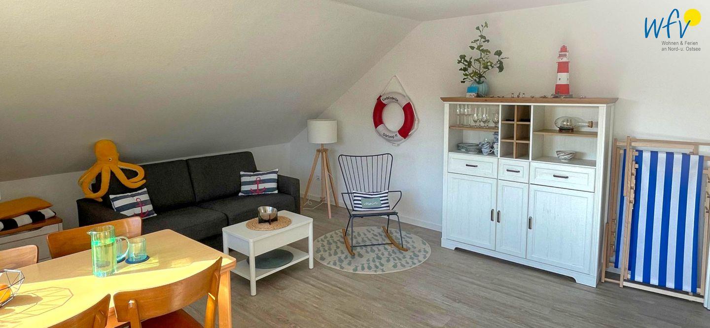 Wenn auf Borkum die Sonne untergeht, können Sie sich in das freundlich eingerichtete separate Schlafzimmer zurückziehen, das mit einem Doppelbett (200 x 200 cm) und einem Kleiderschrank ausgestattet ist. Ein moderner und pflegeleichter Vinylboden sorgt für Gemütlichkeit. Zwei weitere Personen finden auf der Schlafcouch (160 x 200 cm) im Wohnzimmer eine angenehme Nachtruhe.