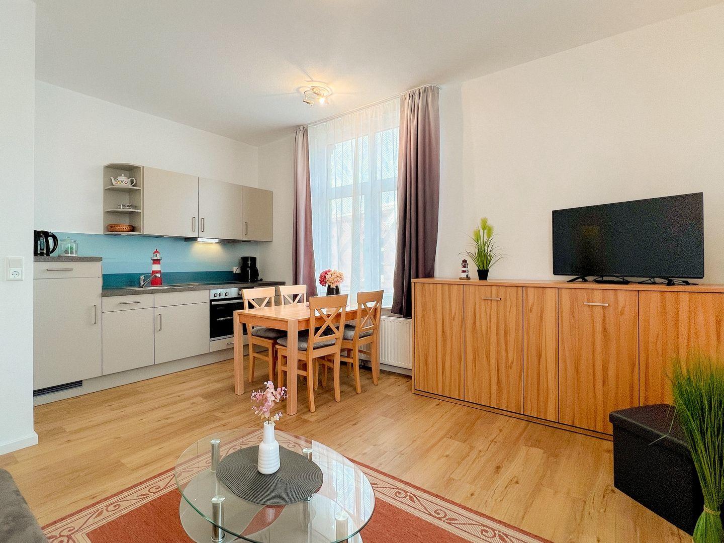Große Fenster sorgen für viel Tageslicht und eine offene, angenehme Atmosphäre. Die Wohnküche ist gut ausgestattet, inklusive Spülmaschine, und lädt dazu ein, den Tag in Ruhe zu beginnen oder abends entspannt ausklingen zu lassen. Kostenfreies WLAN steht zur Verfügung.