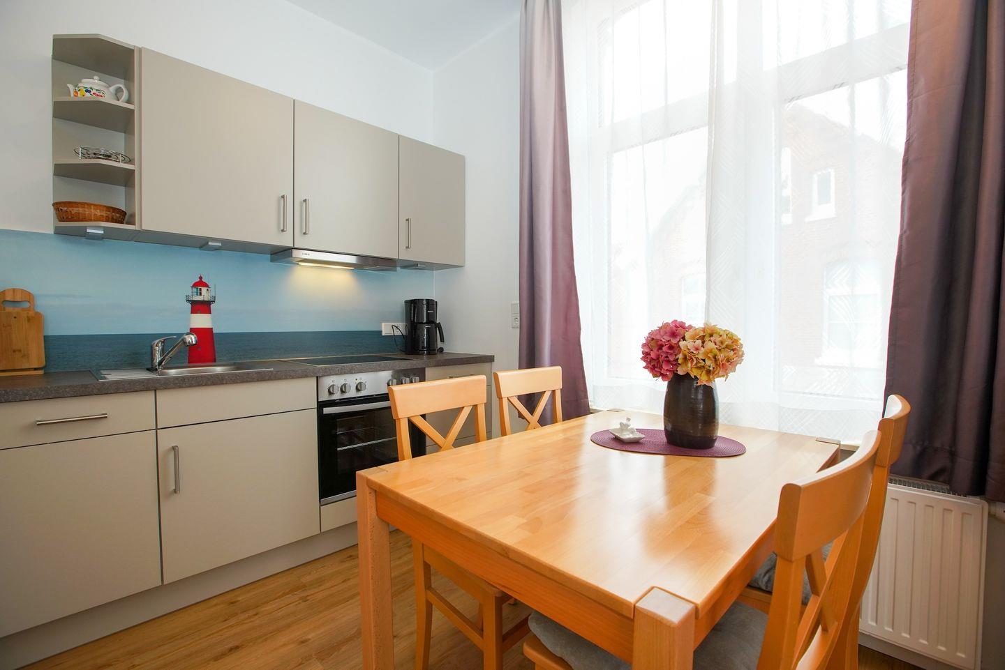 Wohnung 6 im Haus Derk Juist ist eine helle Ferienwohnung im 1. Stock, ideal für Paare. Auf ca. 40 m² bietet sie eine gut ausgestattete Wohnküche, ein separates Schlafzimmer mit Boxspringbett sowie ein Tageslichtbad. Die Wohnung ist haustier- und rauchfrei und liegt zentral im Ortskern von Borkum.