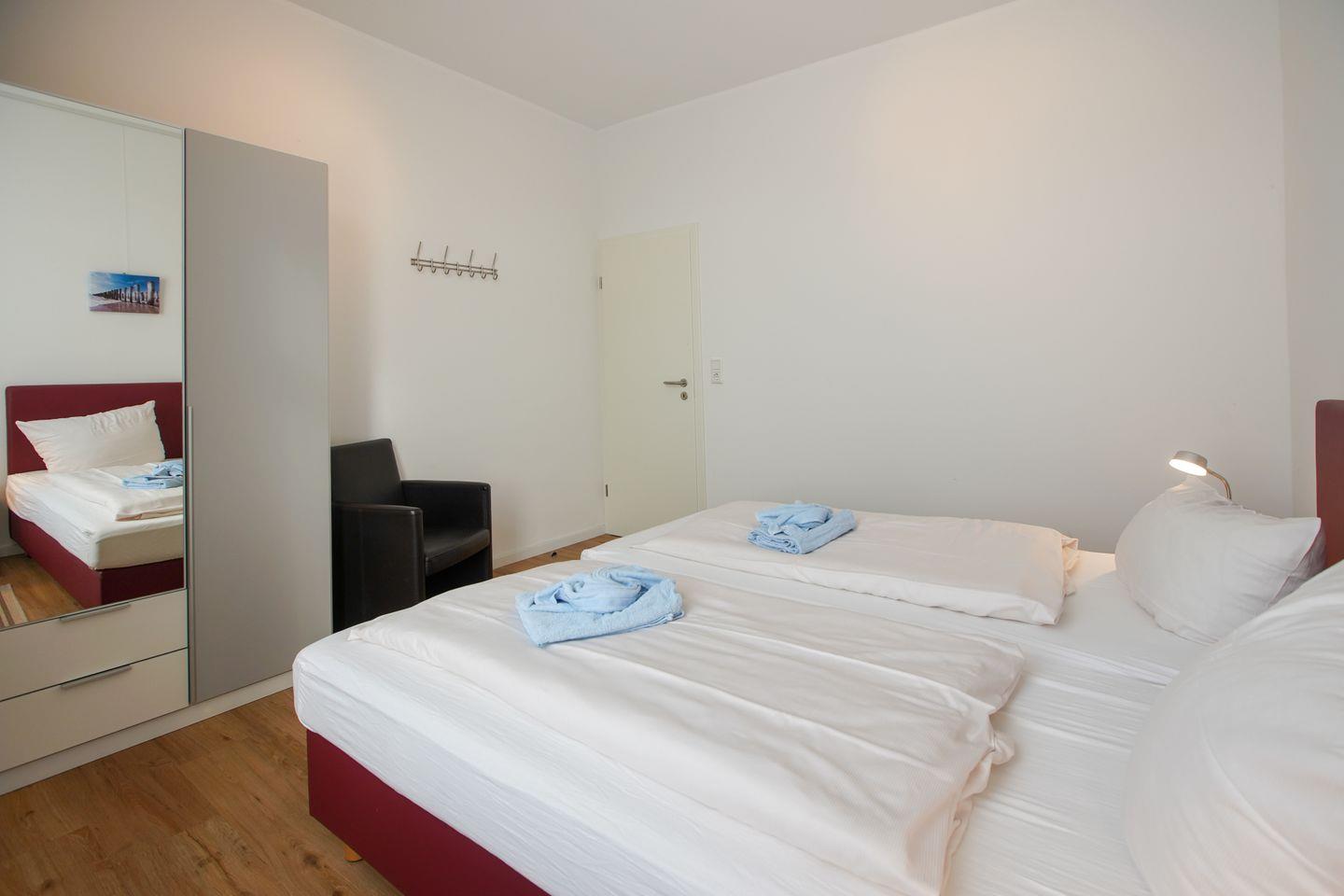 Das separate Schlafzimmer ist mit komfortablen Boxspringbetten ausgestattet. Vom Wohnzimmer aus besteht ein Blick auf den Neuen Leuchtturm. Die Küche ist vollständig ausgestattet, unter anderem mit Spülmaschine, und ermöglicht eine unkomplizierte Selbstverpflegung während des Aufenthalts. WLAN steht kostenfrei zur Verfügung.
